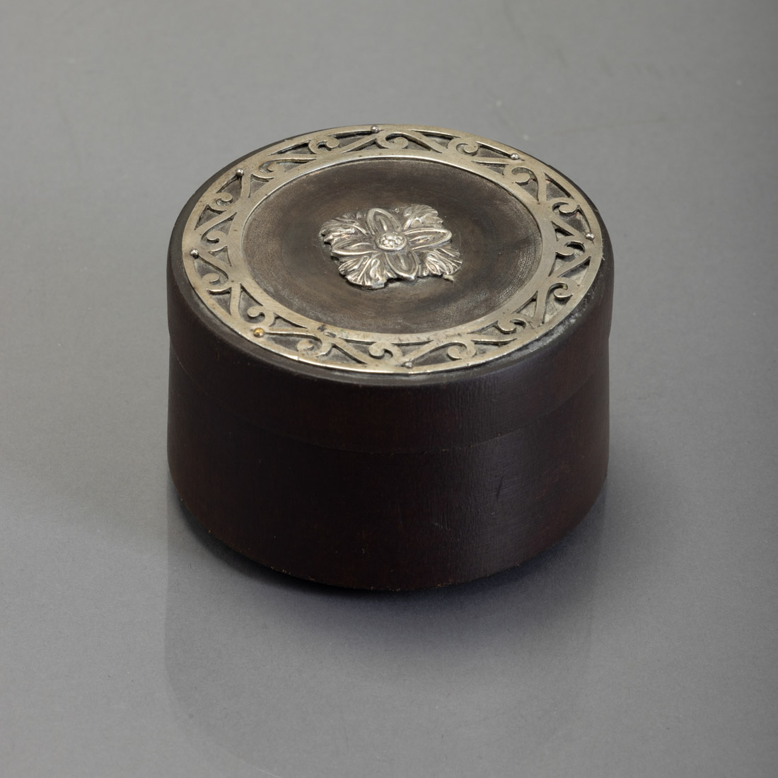 185. CAIXA REDONDA - Em madeira com apli. Em prata