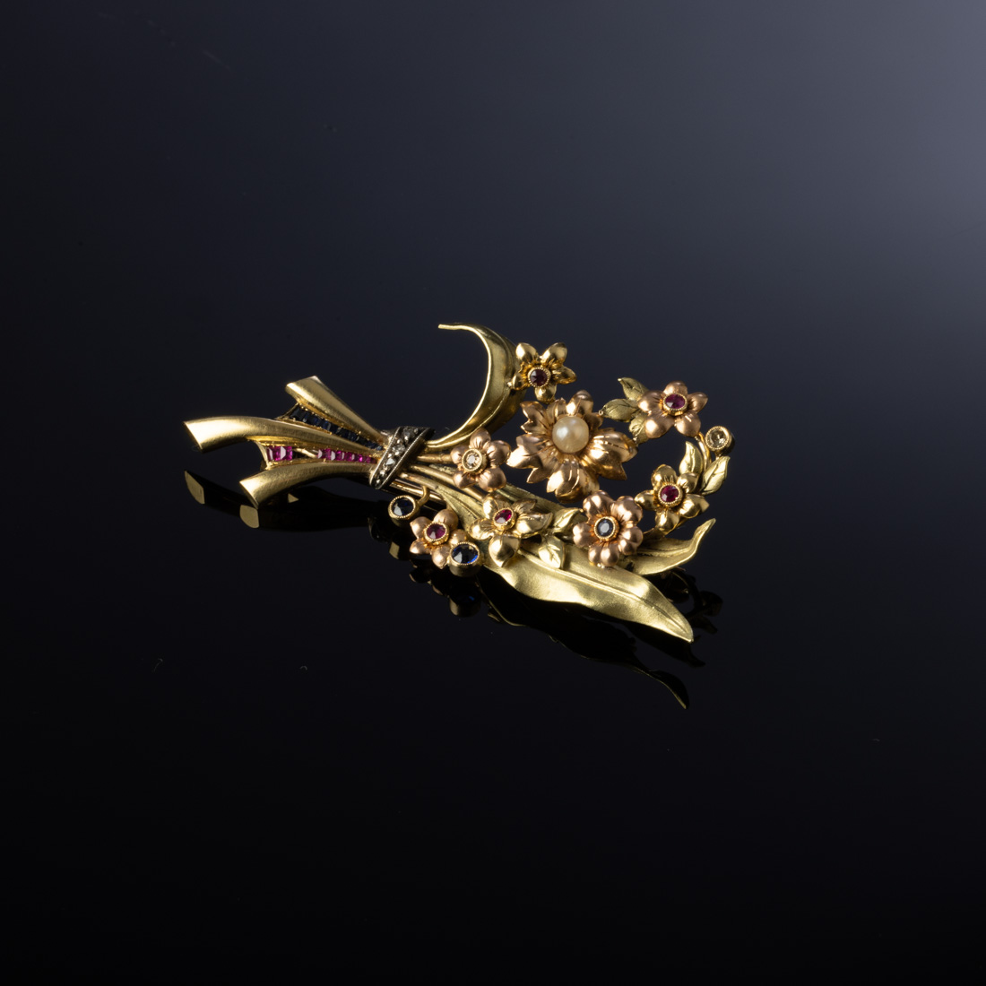 Em ouro português de 19,2Kt., e prata contraste cão e galo (1938-1984), cravejado com diamantes talhe rosa, safiras e rubis. Sinais de uso, faltam alguns rubis.