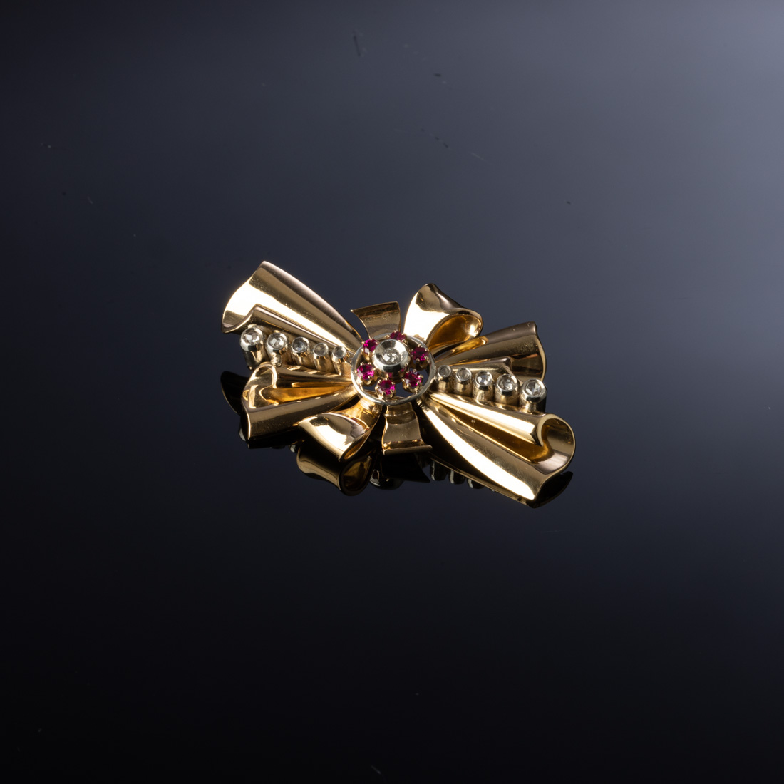 Em ouro português de 19,2Kt., contraste galo (1938-1984) e prata cravejado com diamantes talhe brilhante e rosa, e rubis. Sinais de uso.