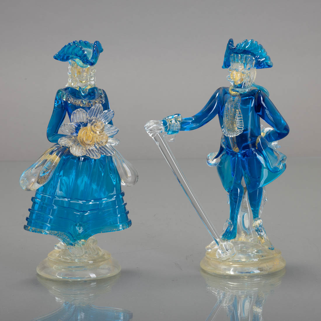 Esculturas em vidro de Murano, decoração a azul e dourado. Sinais de uso.