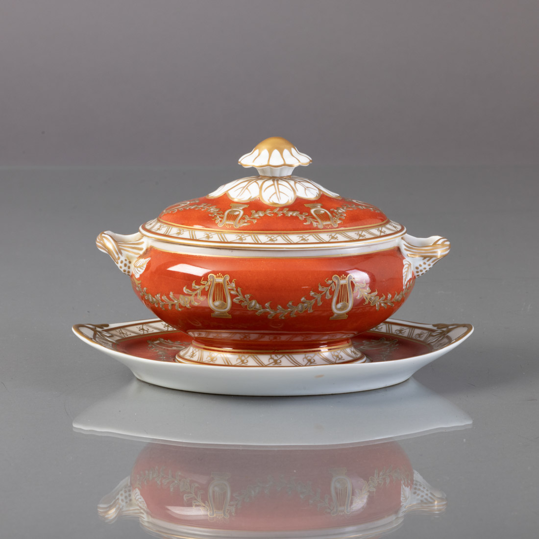 Em porcelana moldada (1947-1968), decoração a rouge de fer e dourado "liras", assinada M Parracho e datada de 1975. Sinais de uso.
