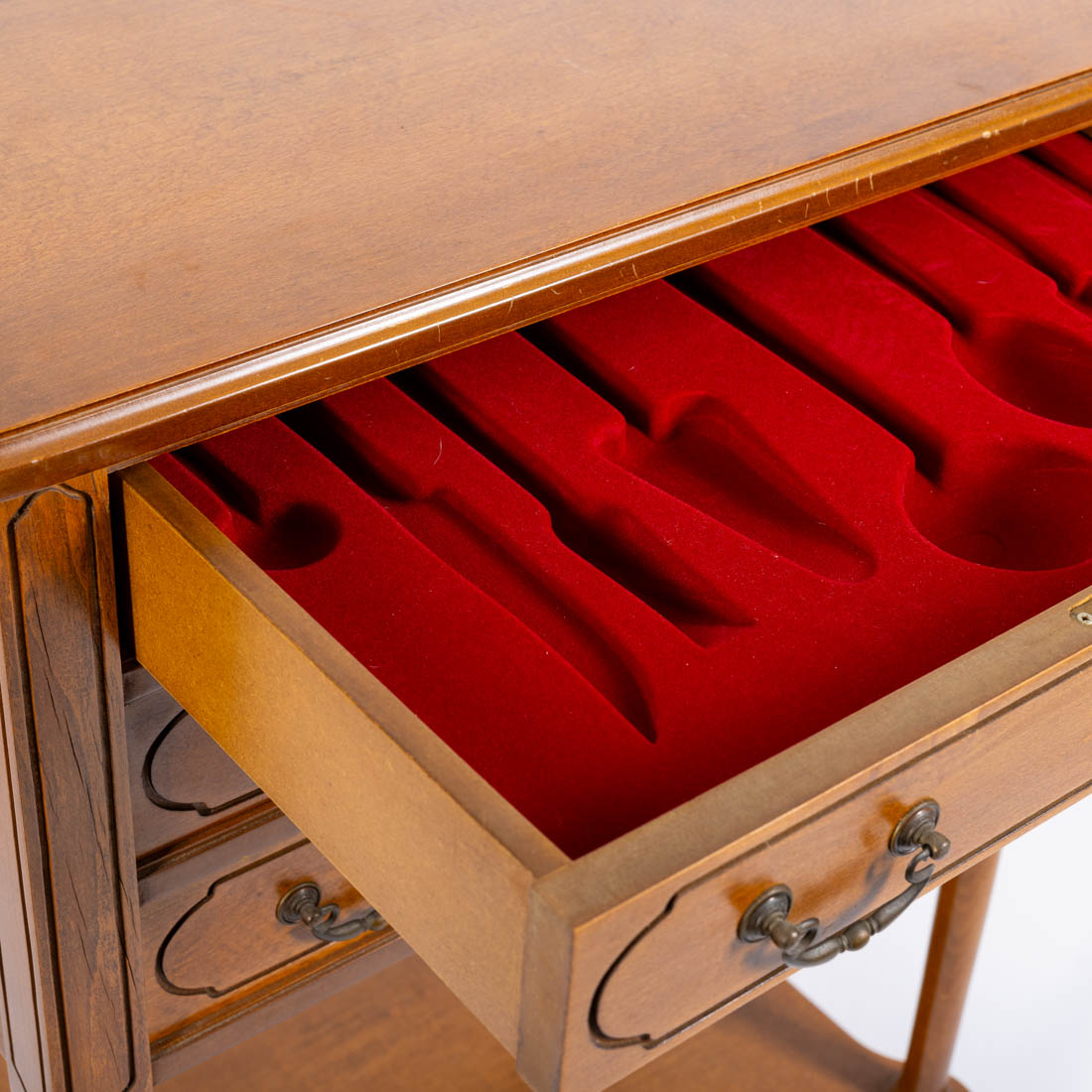Em madeira de três gavetas e puxadores em metal.