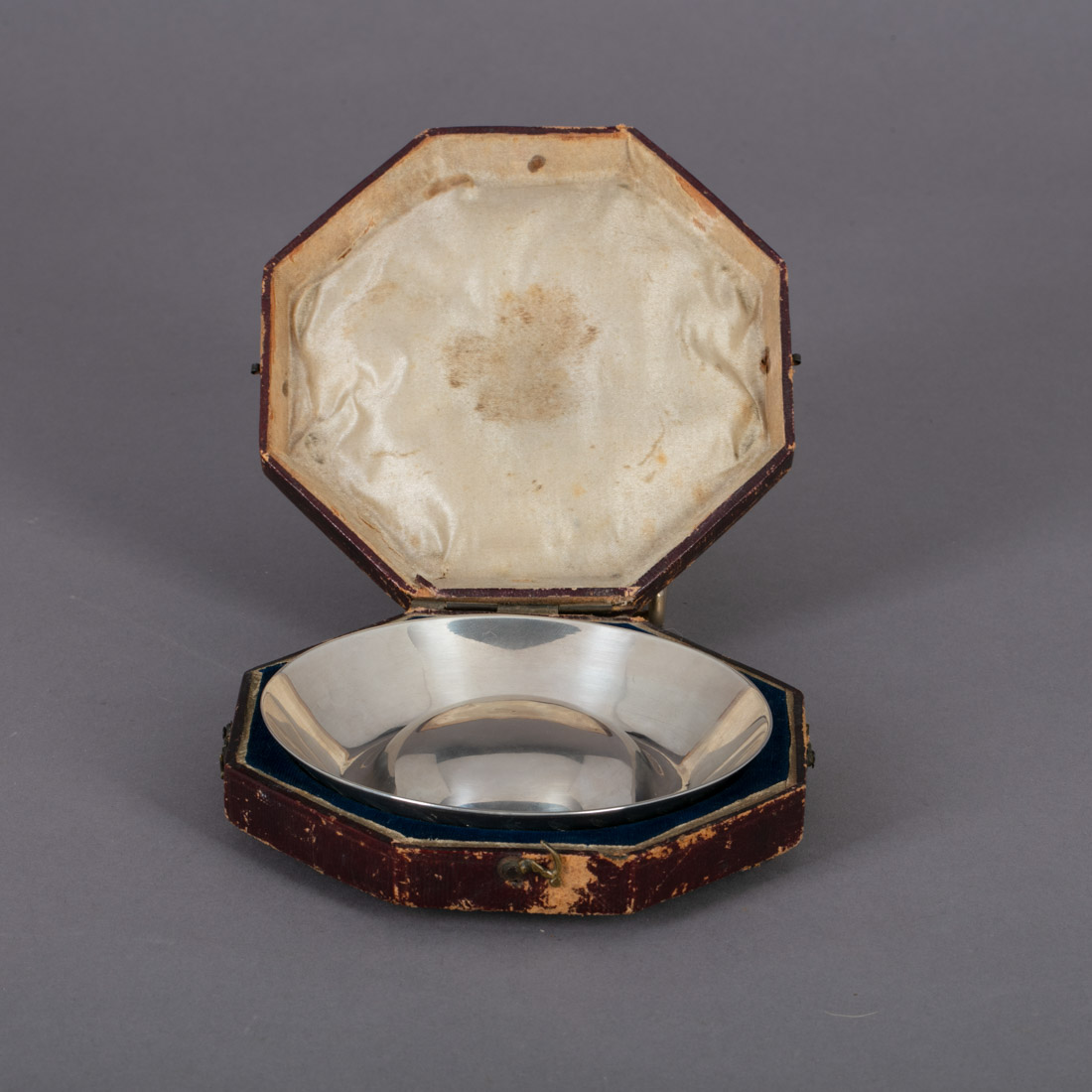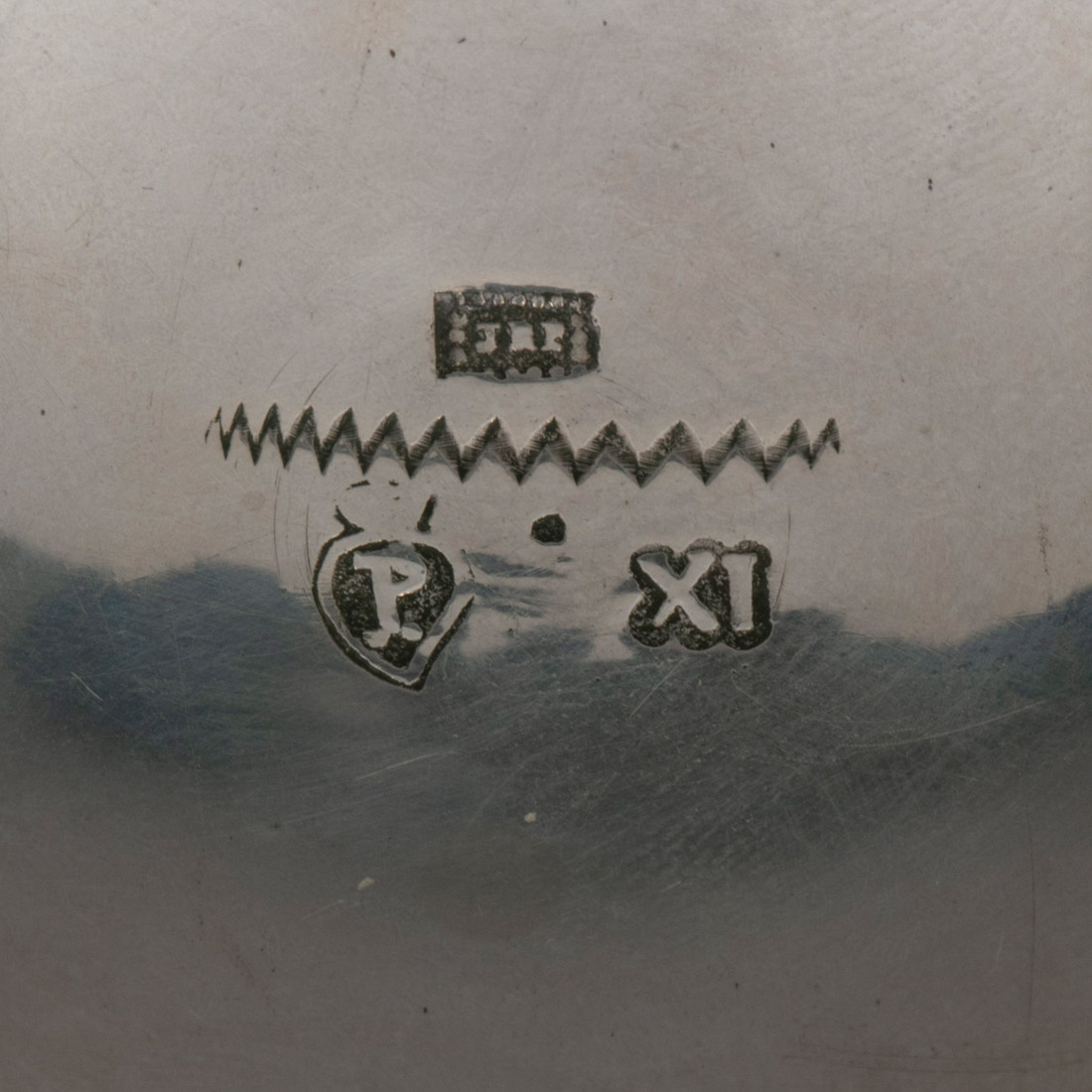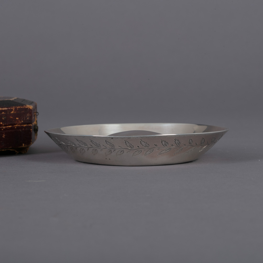 Em prata portuguesa do Séc. XIX, marca de toque de onze dinheiros (P-93) datável 1843-1861, de ensaiador do Porto (P-46) e de ourives (P-415) datável 1853-1861, decoração gravada com elementos vegetalistas. Com estojo. Sinais de uso. Peso aprox.: 123,7 g.Dim.: 11,5 cm.