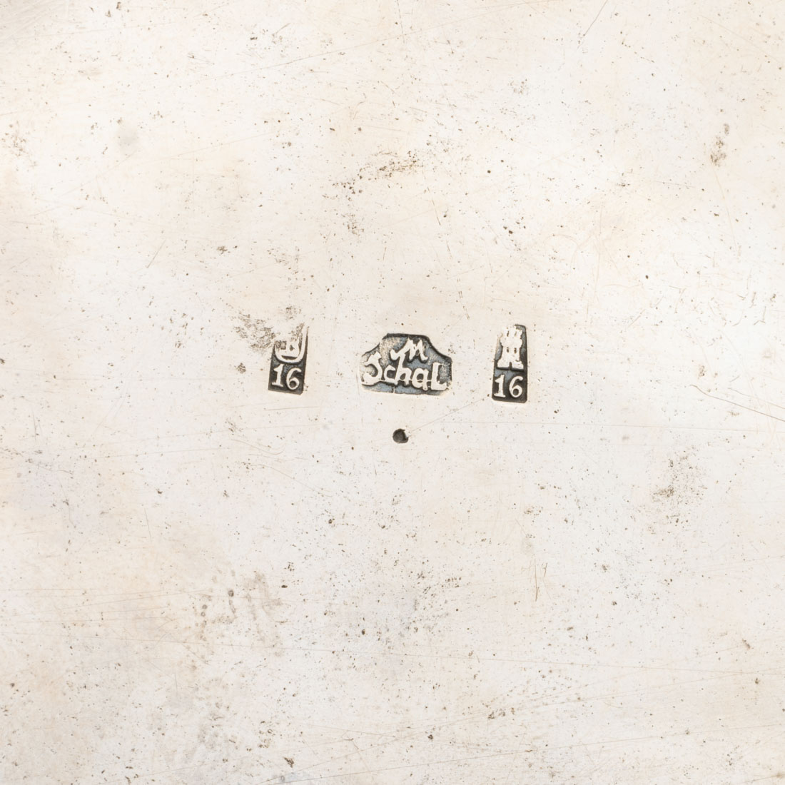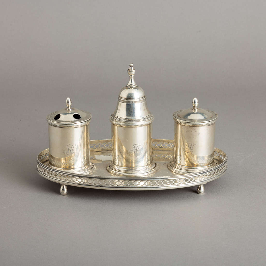 Em prata espanhola do Séc. XIX, marcas da cidade de Madrid (1816), decoração com frisos perlados e gradinha vazada, com tinteiro, areeiro, campainha e suporte para penas. Sem marcas portuguesas, ao abrigo do D/L n.º 120/2017. Peso aprox.: 925 g. Dim: 14x21,5x14 cm. Sinais de uso.