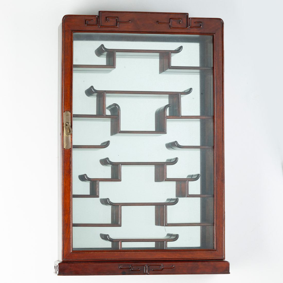 Em tamarindo com entalhamentos, interior compartimentado, porta em vidro, puxador em metal amarelo. China, Séc. XX. Sinais de uso.