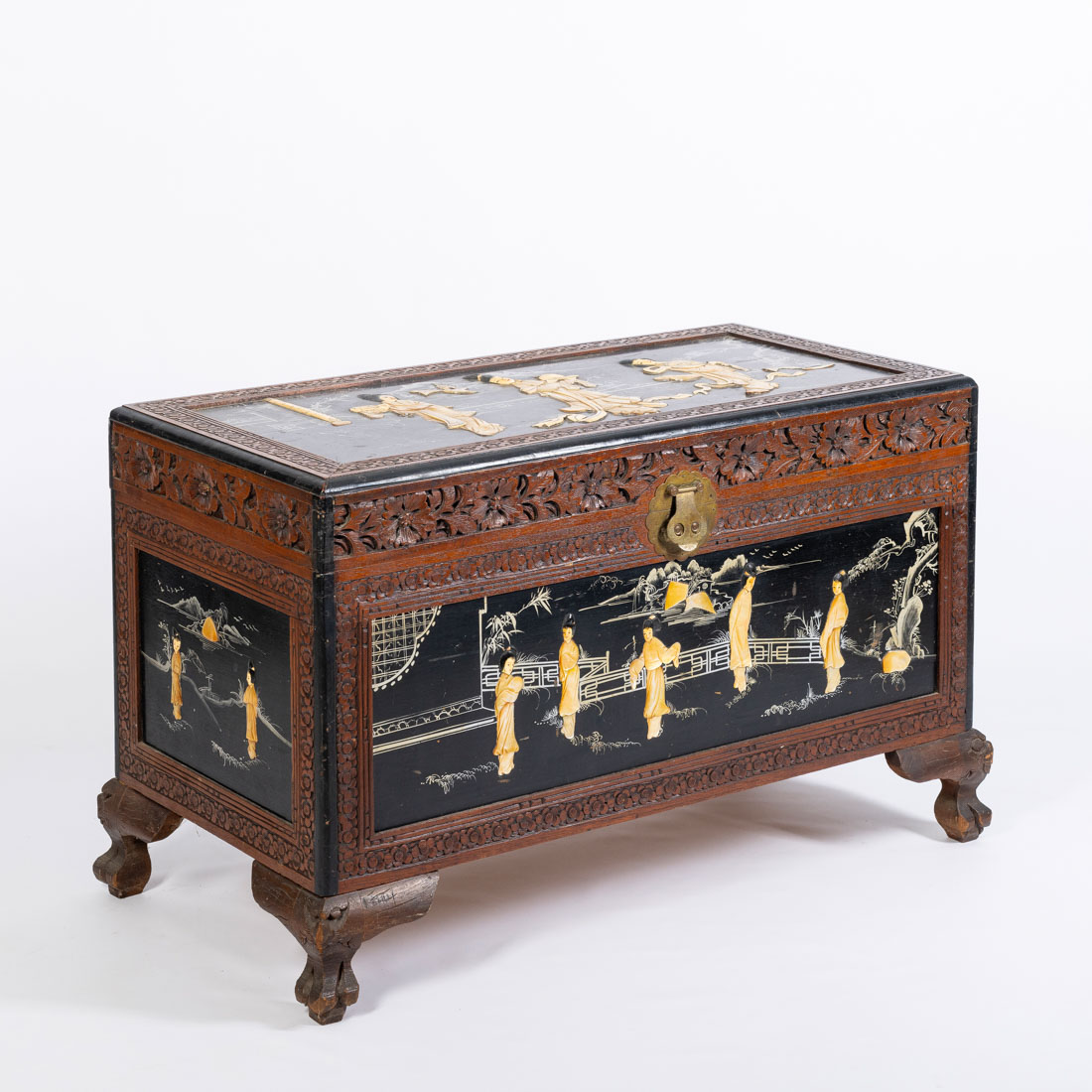 Em canfora com entalhamentos vegetalistas, decoração parcialmente lacada a negro "Paisagem com figuras orientais" esculpidas em madrepérola e outros materiais. Sinais de uso e pequenos defeitos.