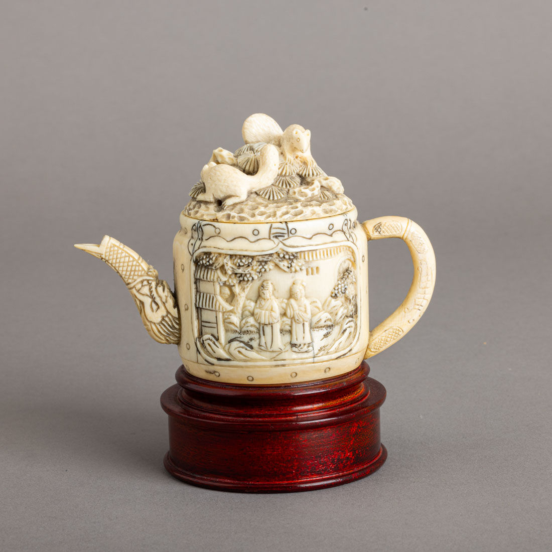 Escultura em marfim, decorado com cenas do quotidiano em baixo-relevo, tampa com dois esquilos, base em madeira. China, meados do Séc. XX. Sinais de uso.