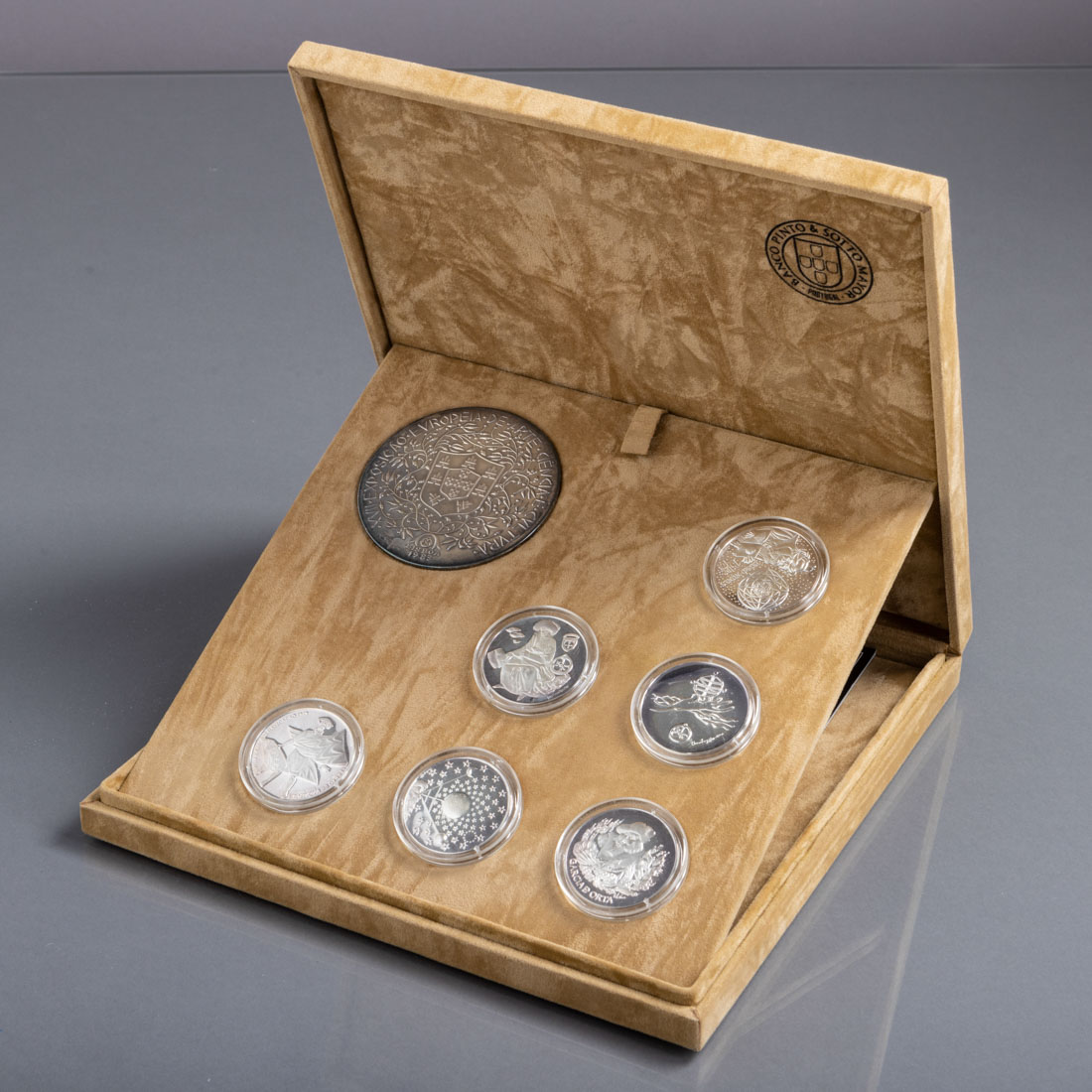 Em prata portuguesa contraste águia (pós 1985) de 916, colecção de sete medalhas nº 1760/4000 da XVII Exposição Europeia de Arte Ciência e Cultura, Lisboa - 1983. Em estojo original. Sinais de uso.