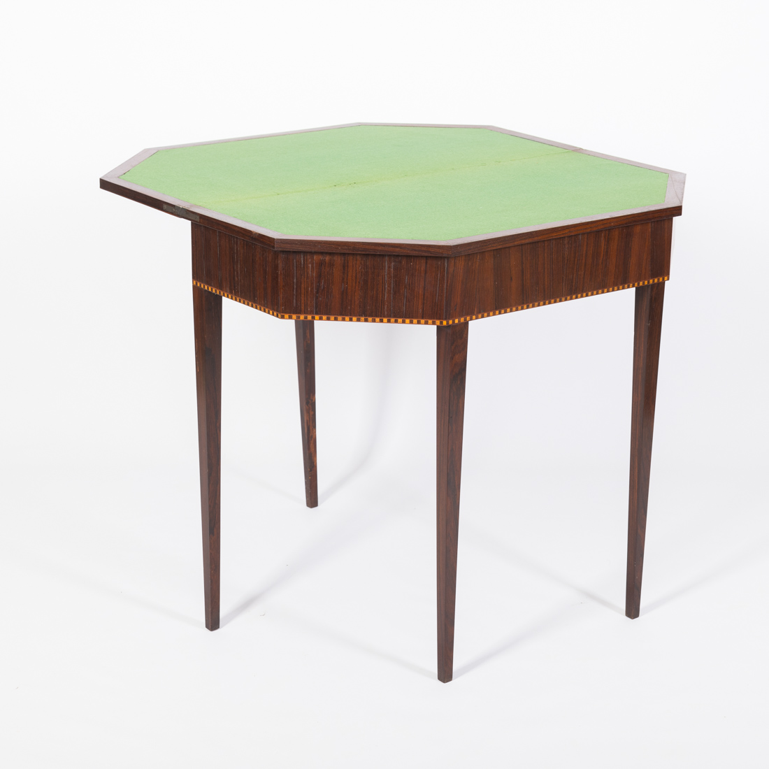 Marchetaria em pau santo e outras madeiras "elementos vegetalistas", tampo de cantos cortados. Pequenas falhas e defeitos.