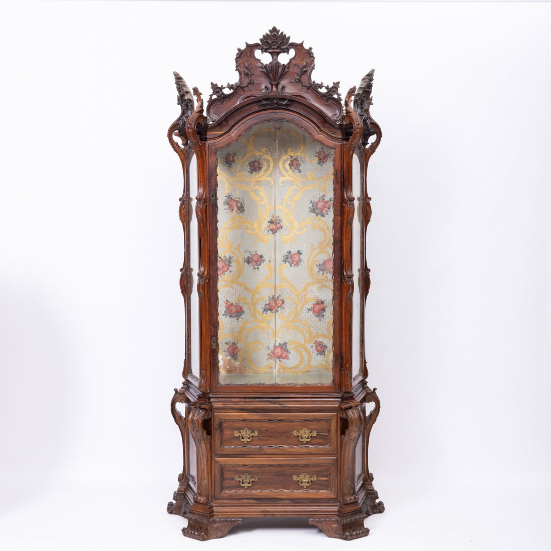 Em pau santo com entalhamentos, cimalha recortada e vazada, interior com pintura policromada e dourada "flores". Adaptado a vitrine com prateleiras em vidro, base em pau santo a condizer com duas gavetas. Falhas e pequenos defeitos.