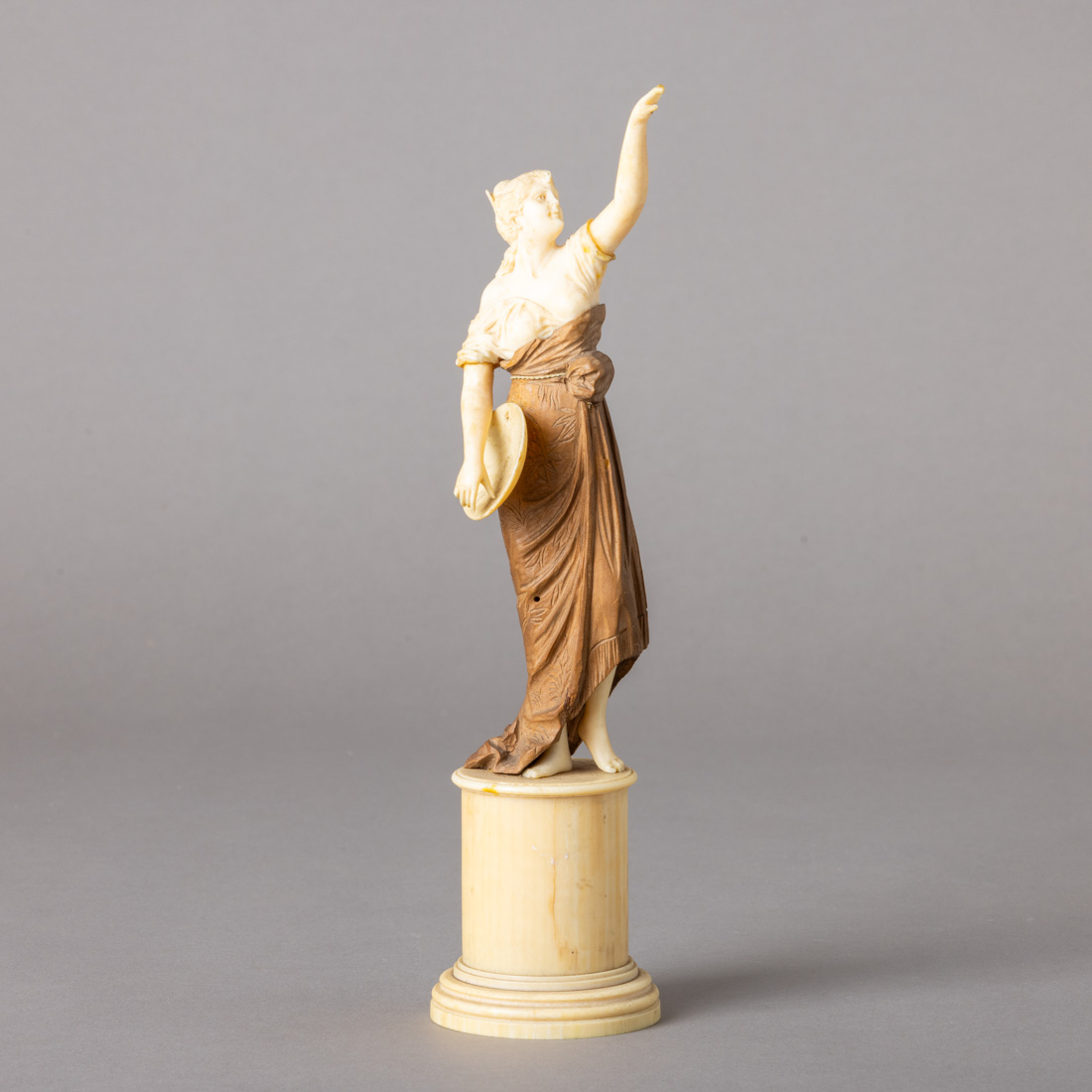 Escultura em marfim e madeira, Europa, Séc. XX, base em marfim torneado. Pequenas falhas, braço colado e sinais de xilófagos na madeira.
