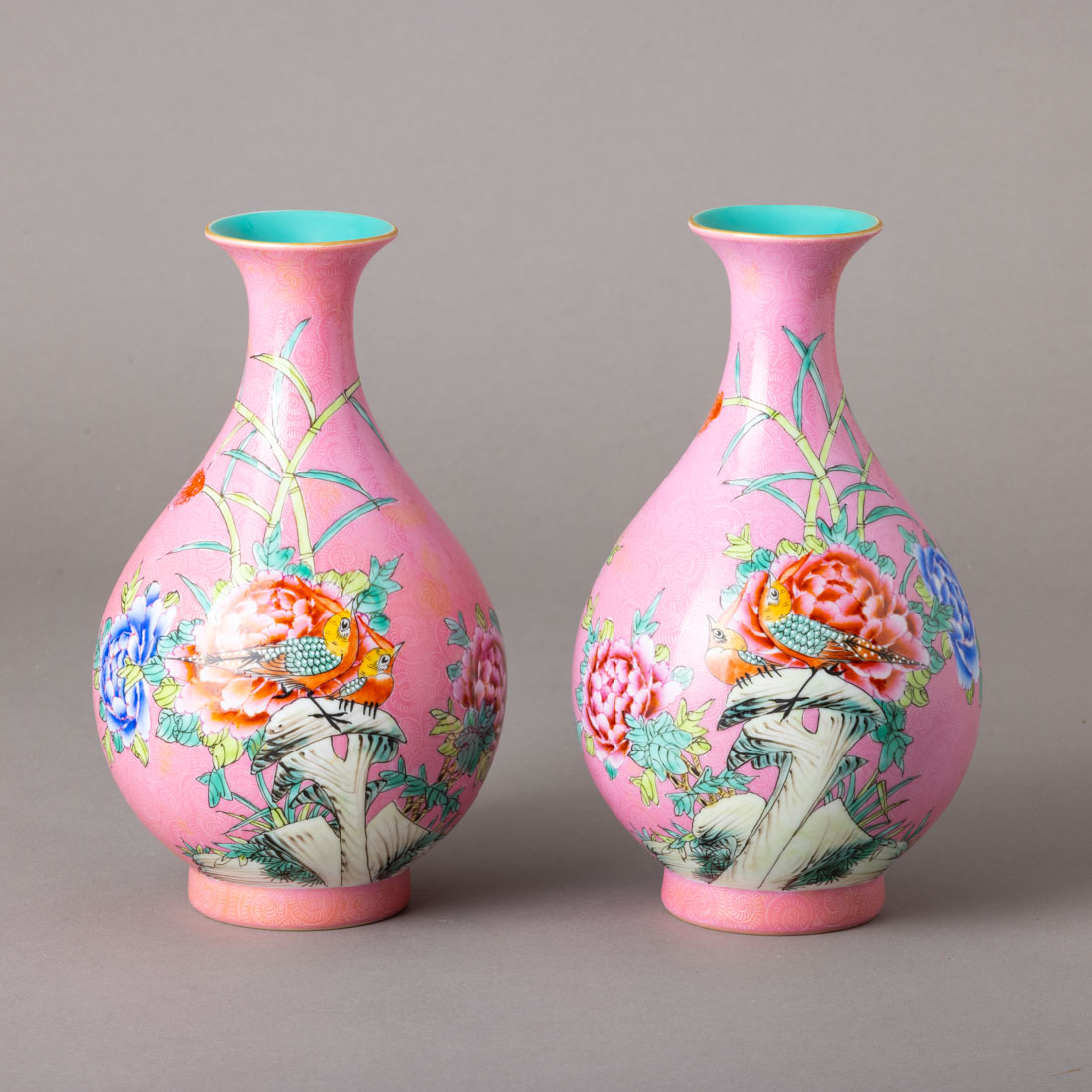 Em porcelana da China, decoração policromada "flores e pássaros", sobre fundo rosa gravado. Marcada. Sinais de uso.