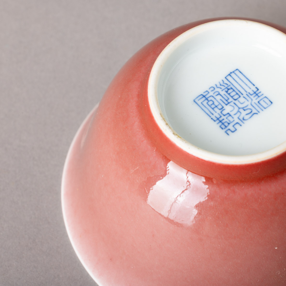 Em porcelana da China, decoração monocroma "sangue de boi". Marcada. Sinais de uso.