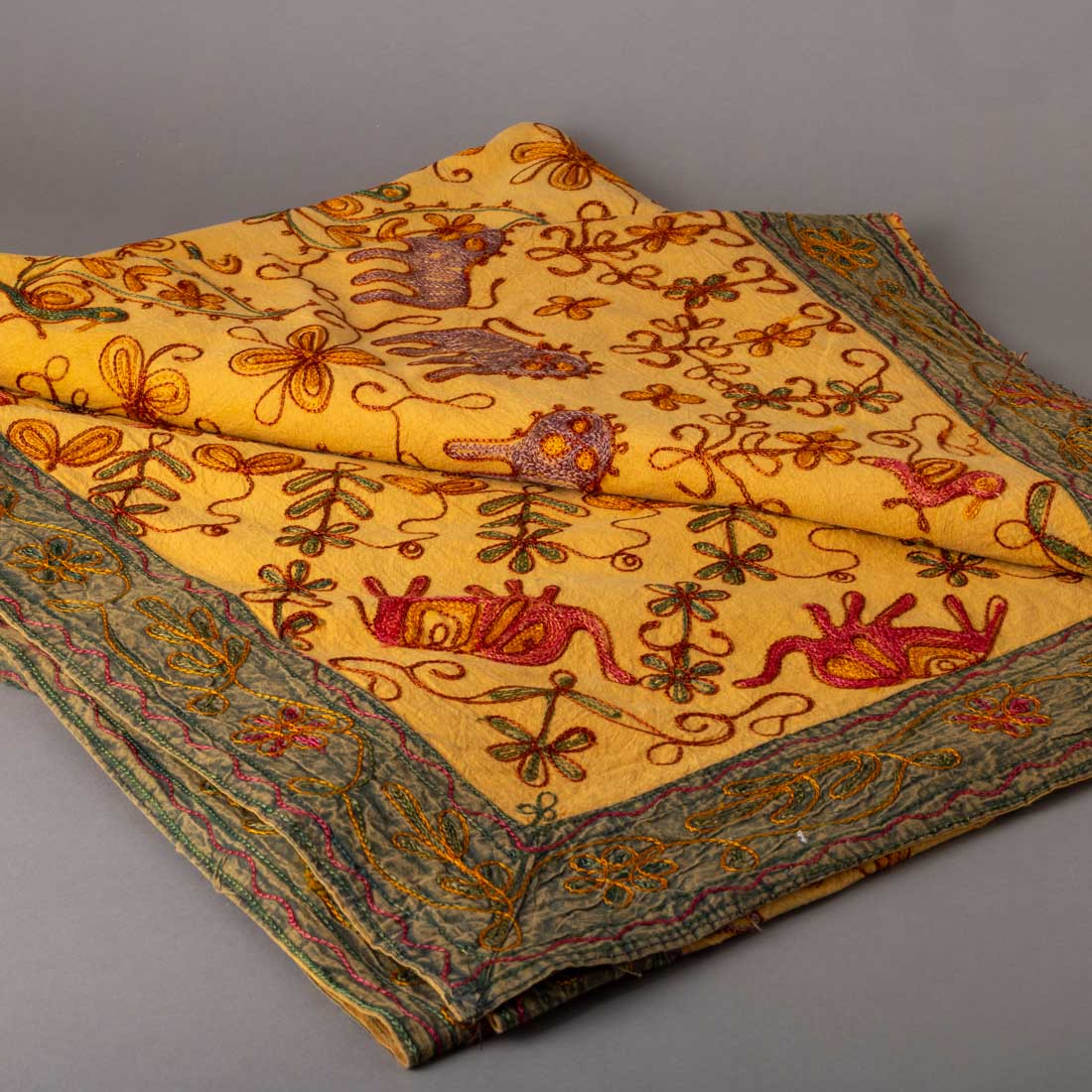 Em tecido bordado, decoração policromada com flores, animais e figuras. Sinais de uso.
