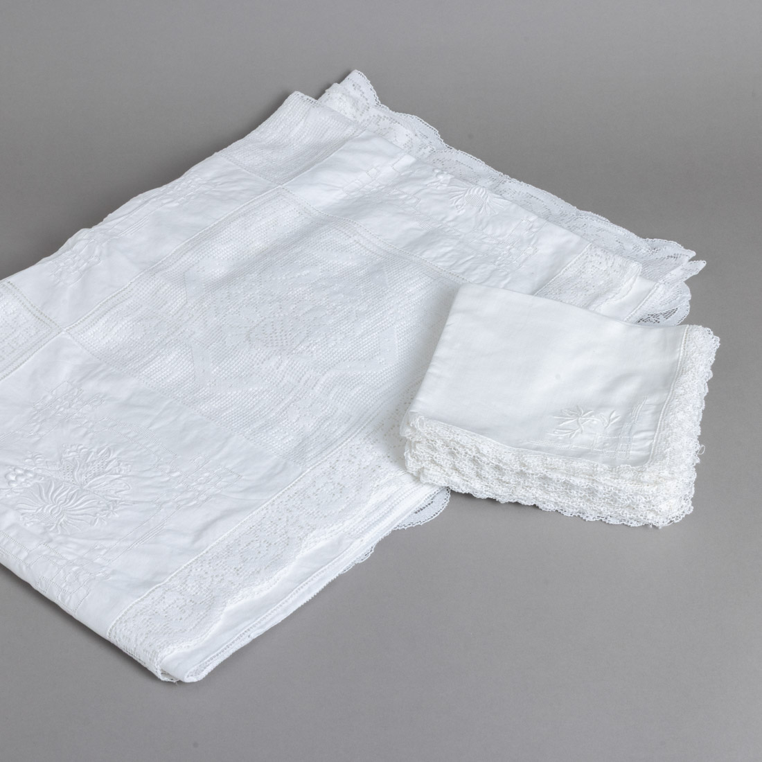 Em linho bordado, com aplicação de rendas. Sinais de uso e pequenas manchas.