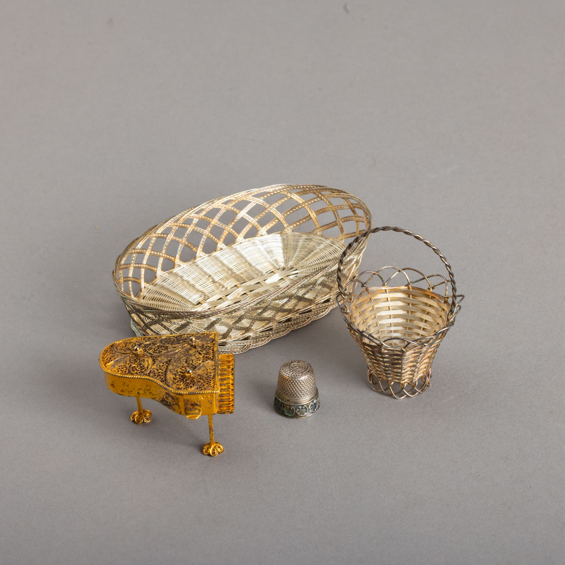 127. DUAS CESTAS, PIANO MINIATURA E DEDAL Em prata e filigra de prata 833 e 835 P.86