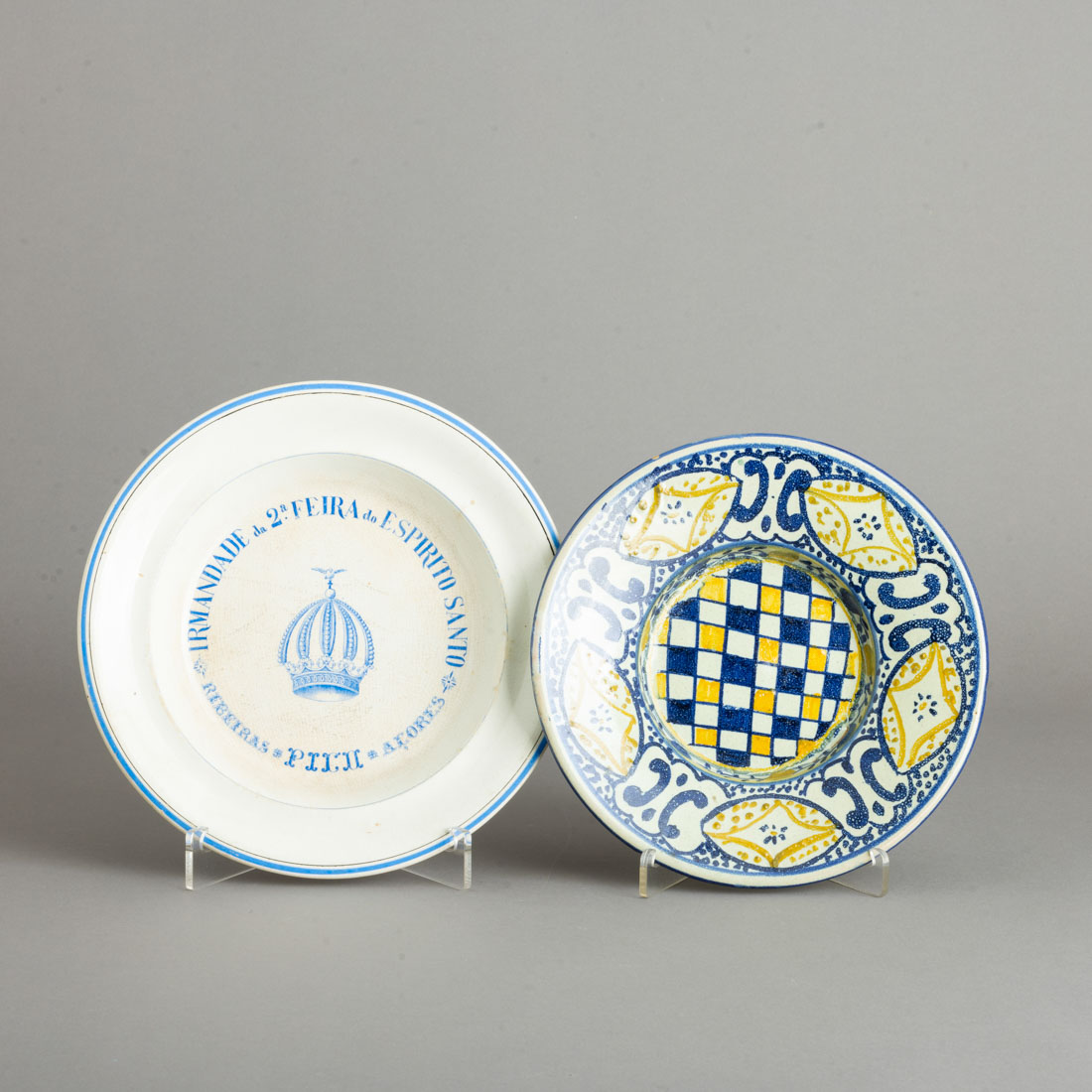 Um em loiça pó de pedra fabrico de Alcântara, Lisboa decoração a azul com legenda "Irmandade da 2ª Feira do Espirito Santo - Ribeiras - Pico - Açores, outro em cerâmica vidrada decoração policromada marcado C. Vieira, S. Miguel. Sinais de uso. Dim.: 24 e22 cm.