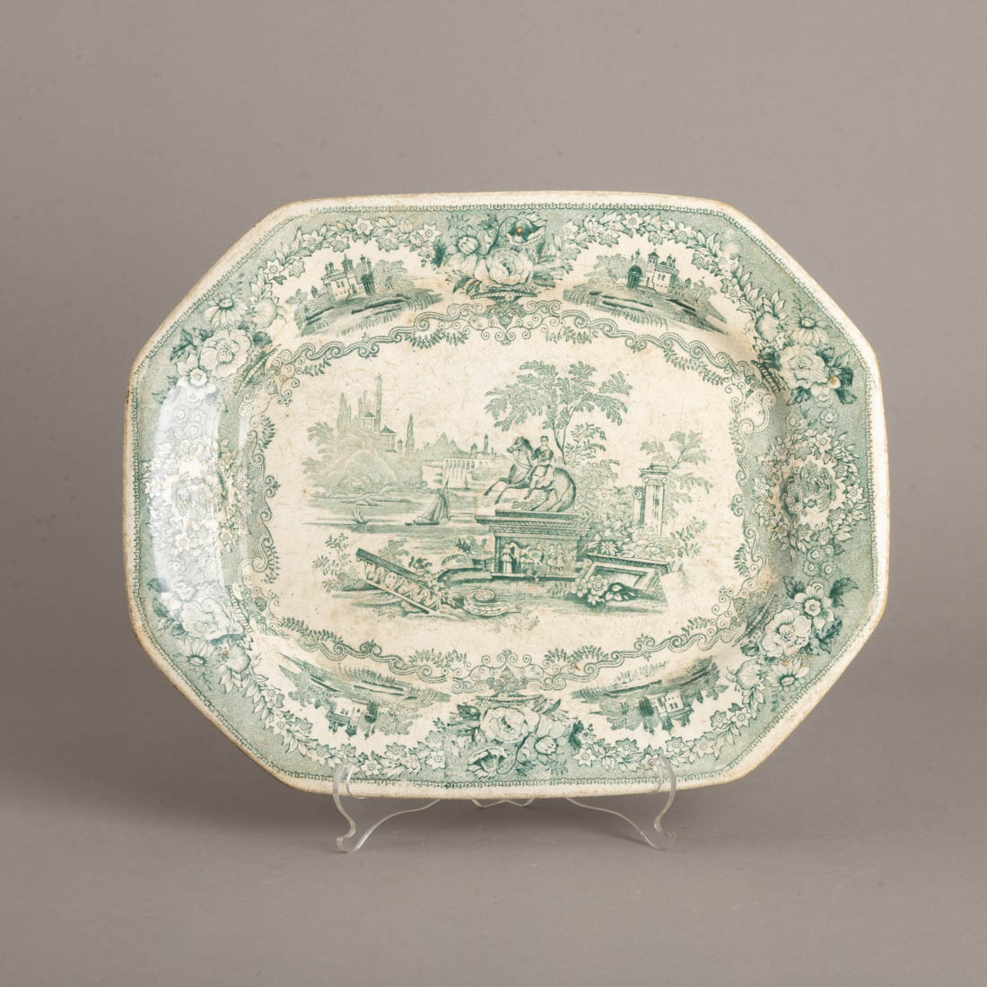 Em loiça pó de pedra de Sacavém, decoração a verde "Estátua", dita cavalinho. Marcada. Sinais de uso e desgaste.
