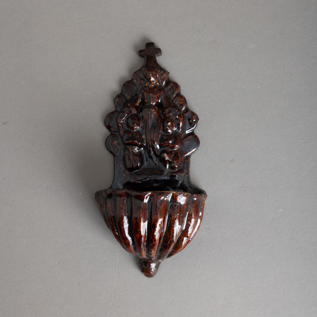 Em cerâmica vidrada, possivelmente Caldas, decoração relevada monocroma a castanho com Virgem e anjos. Ligeiras esbeiçadelas.