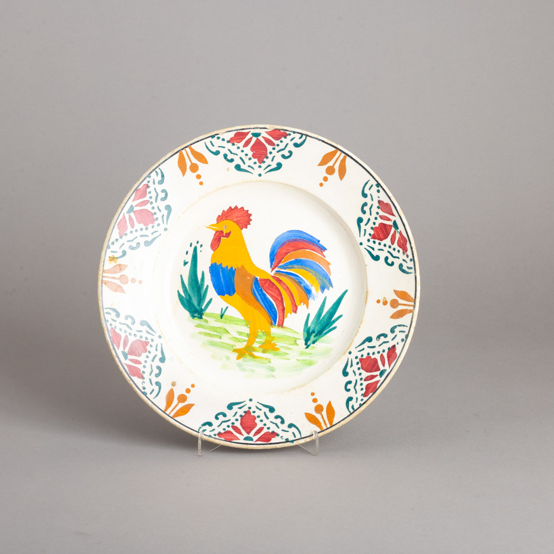 Em faiança portuguesa, decoração policromada "galo". Séc. XIX/XX. Desgaste no vidrado.