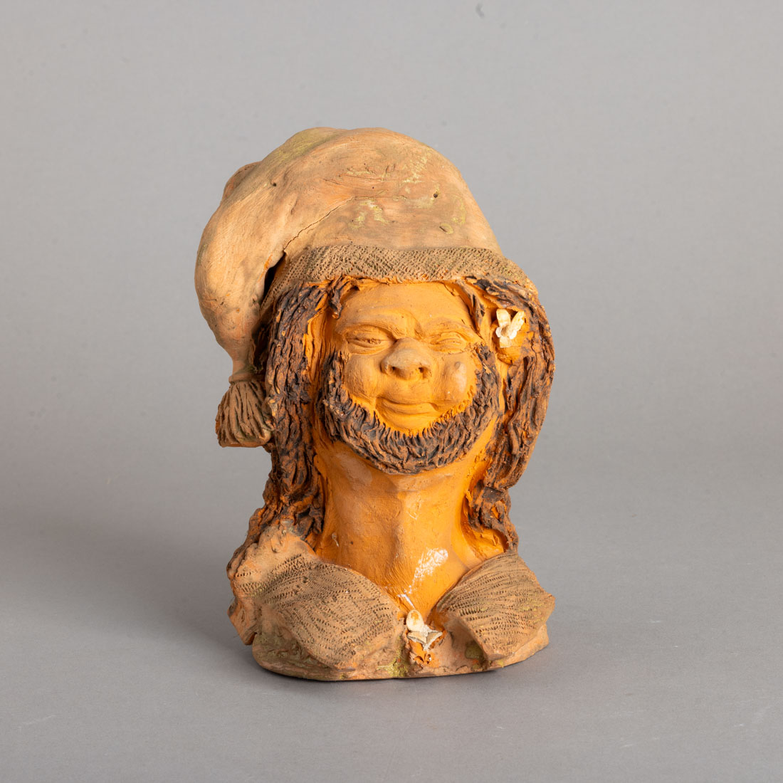 Escultura em barro parcialmente policromado, assinada. Algumas falhas.