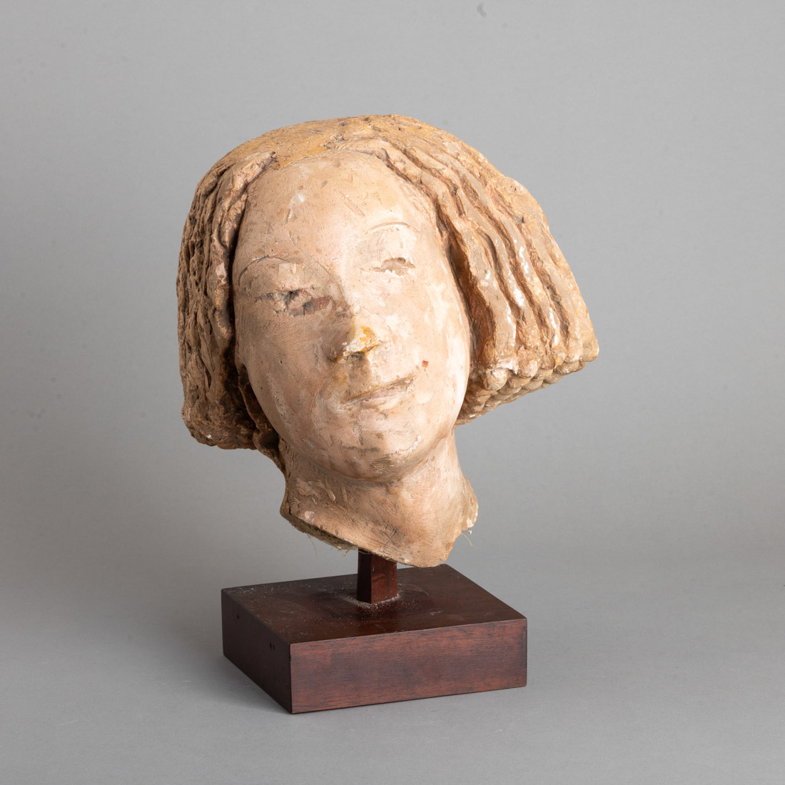 Escultura em gesso patinado, base em madeira. Pequenas falhas e pequenos defeitos.