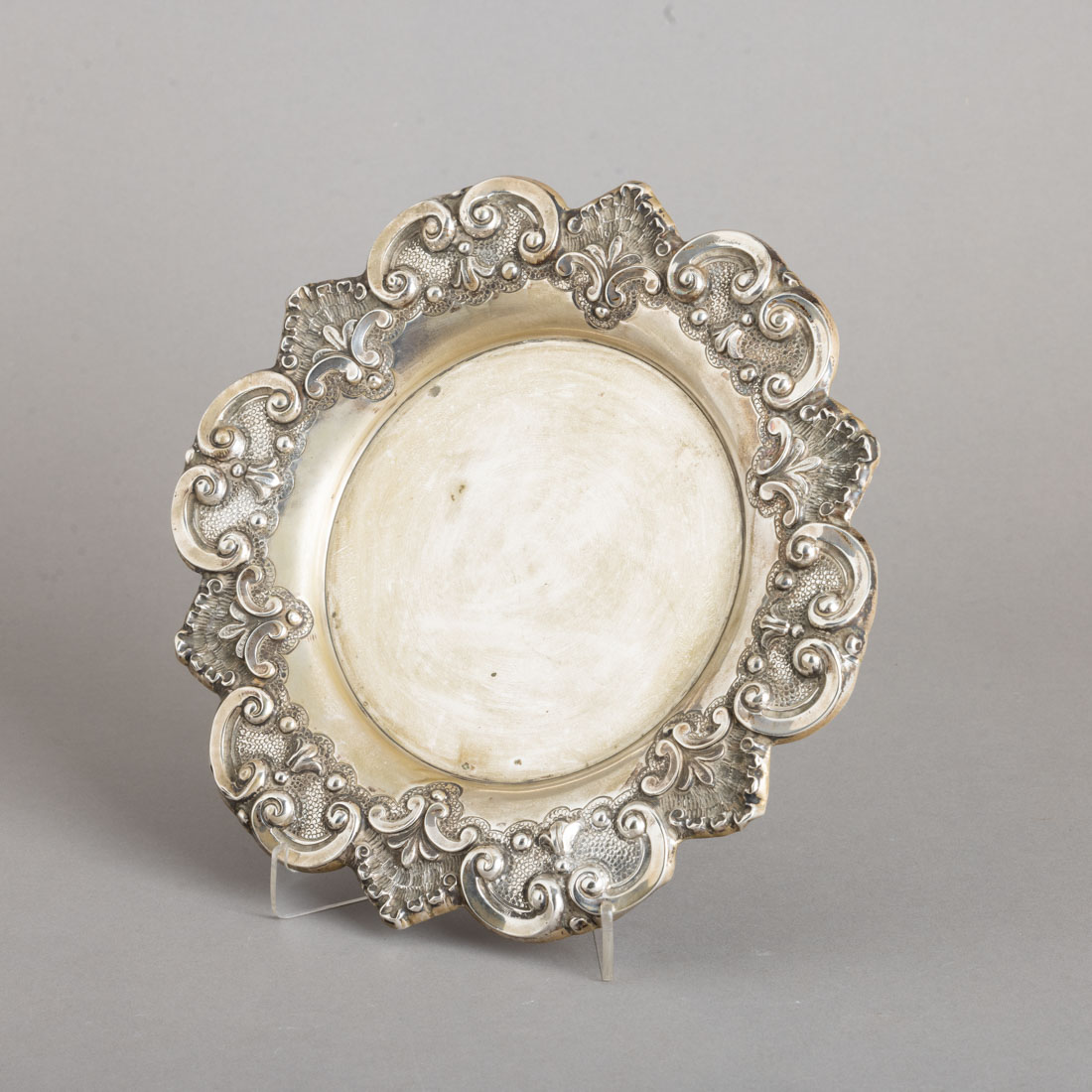 Em prata portuguesa contraste águia (1938-1984) de 833, aba relevada decorada com enrolamentos e concheados. Sinais de uso, pequenas amolgadelas na aba.