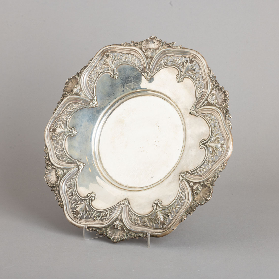 Em prata portuguesa contraste javali (1887-1937) de 833, decoração relevada e vazada com elementos vegetalistas e concheados. Sinais de uso e pequenas amolgadelas.