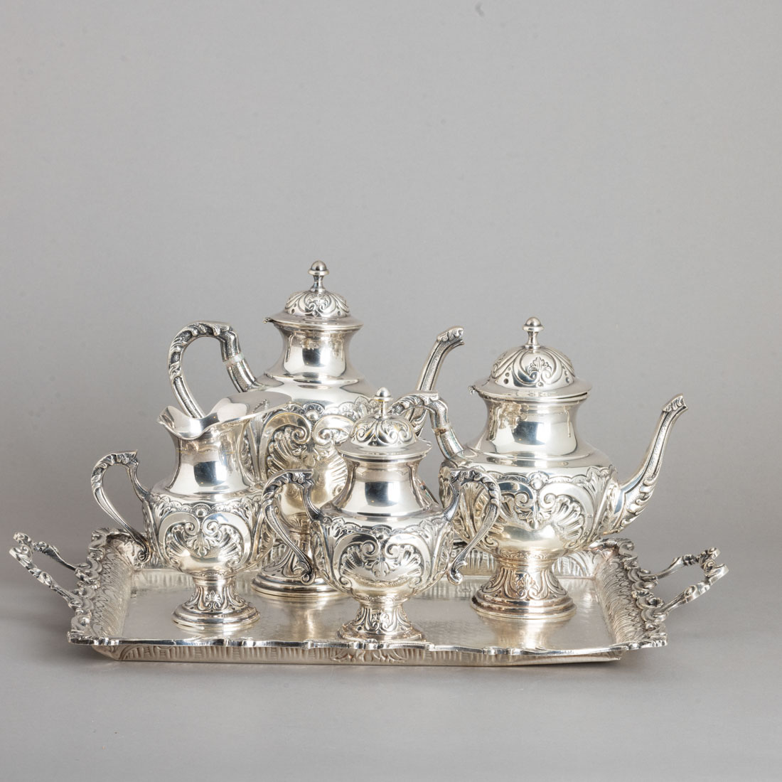 Em metal prateado, decoração relevada com enrolamentos e concheados. Composto por bule, cafeteira, leiteira e açucareiro. Sinais de uso, tabuleiro com pequena amolgadela