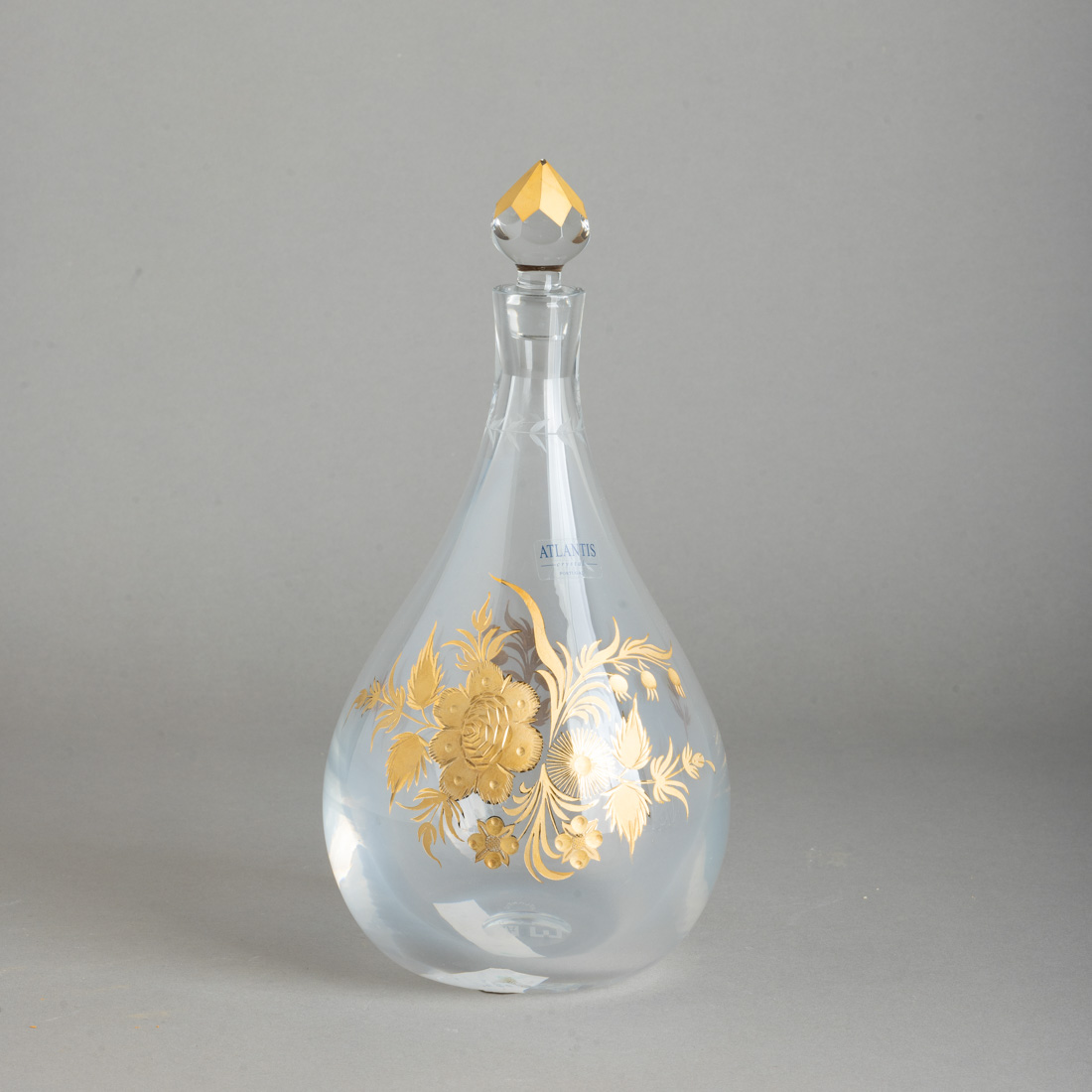 Em cristal Atlantis, decoração moldada, lapidada e dourada com motivos florais. Sinais de uso, ínfima esbeiçadela na ponta da tampa