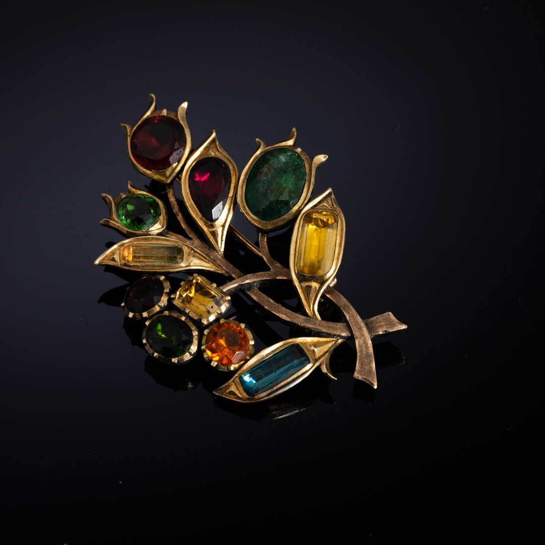 Em ouro e prata cravejado com água marinha, esmeraldas, ametistas e topázios. Sem marcas, ao abrigo do Decreto-Lei n.º 120/2017. Sinais de uso.