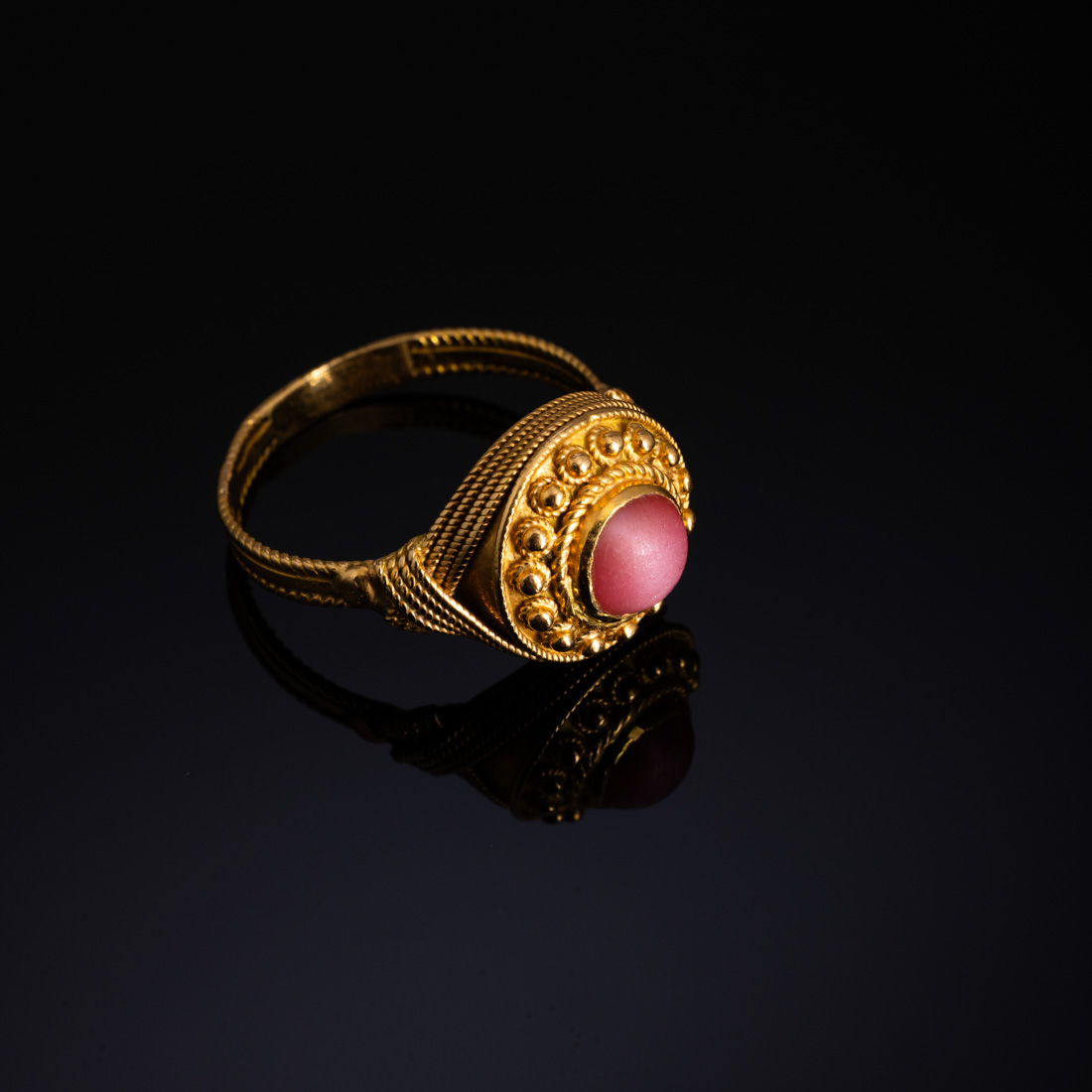 Em ouro português de 19.2Kt., contraste dragão (1938-1984) cravejado com coral do Mediterrâneo. Sinais de uso, pequeno defeito.