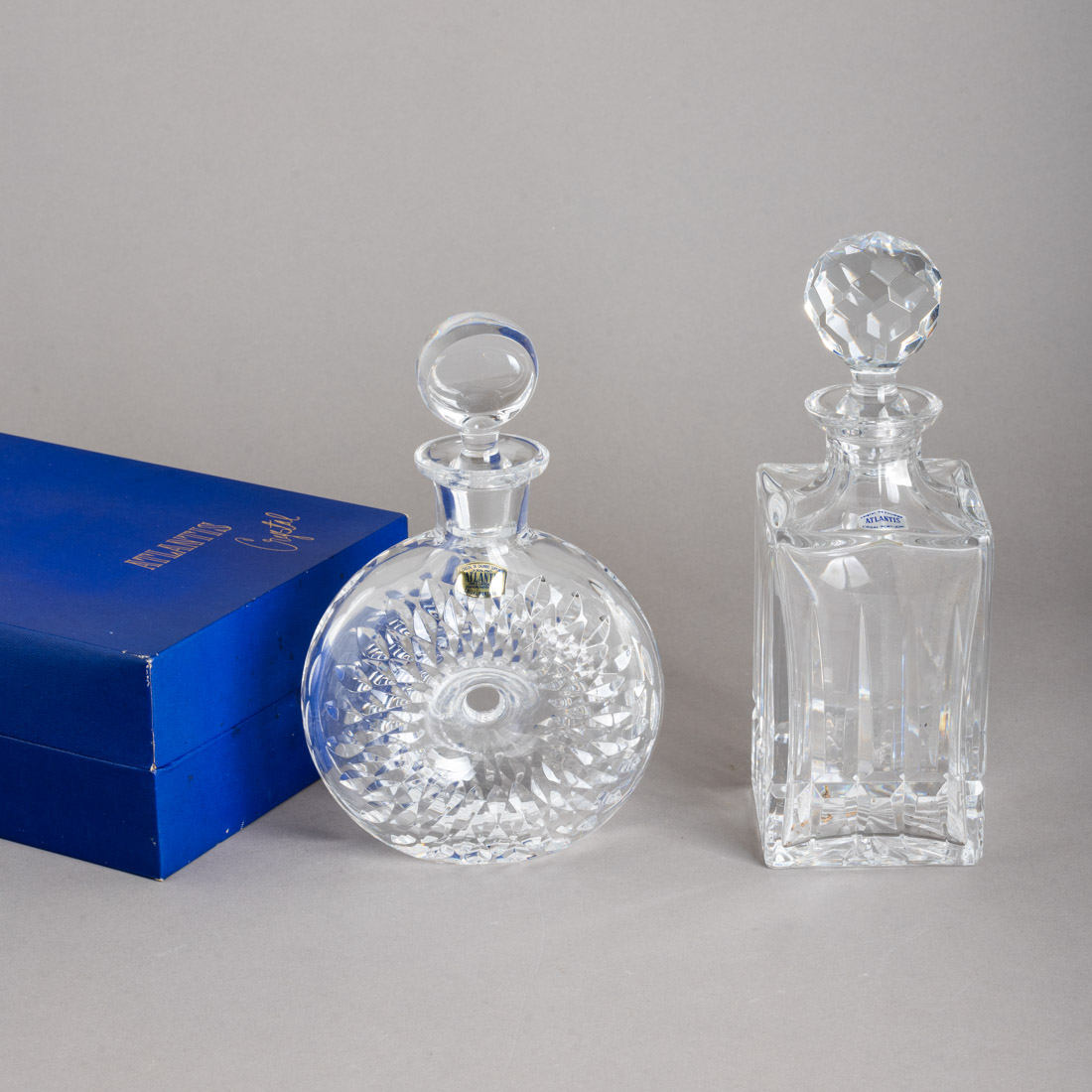 Em cristal Atlantis, decoração moldada. Uma com estojo original. Sinais de uso.