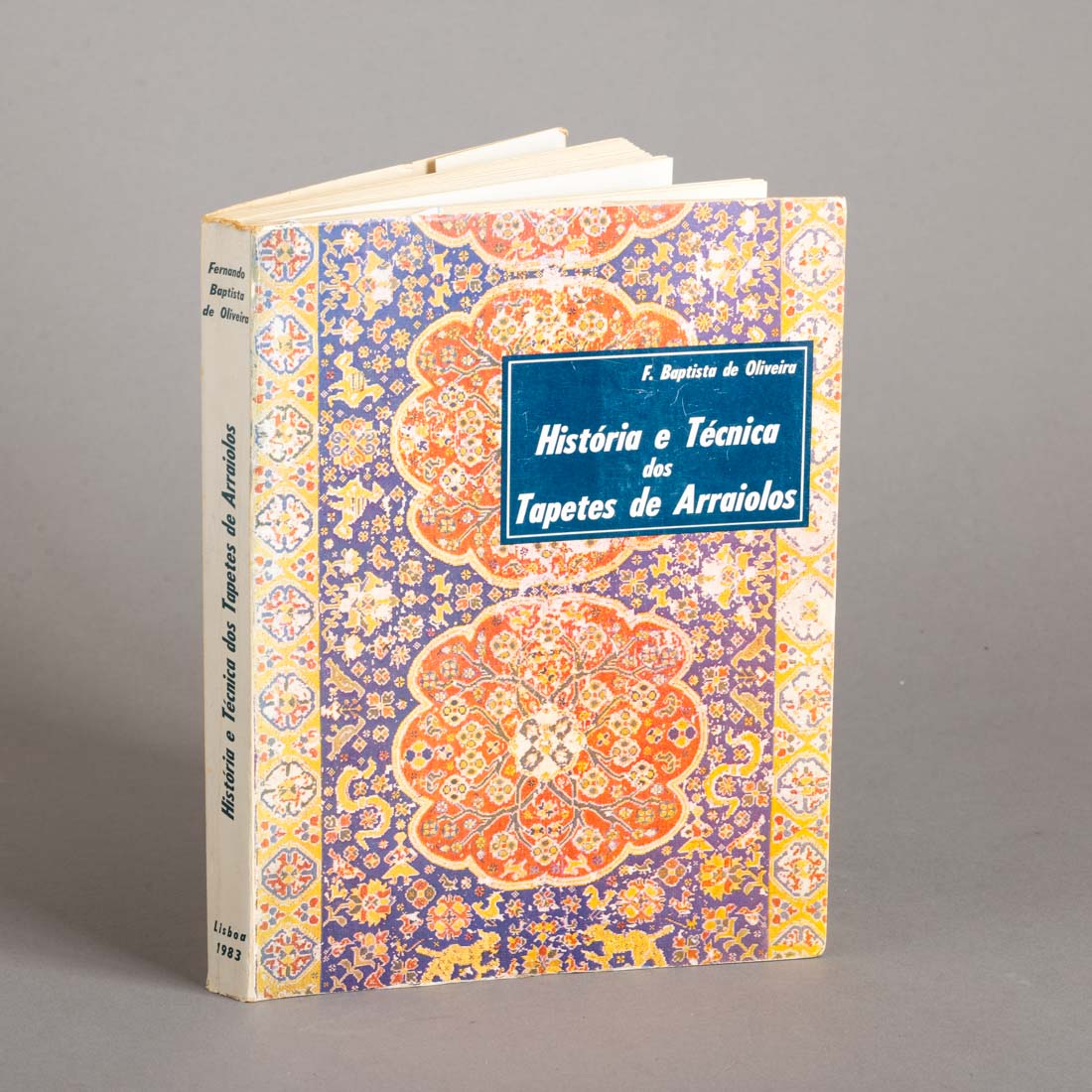 Livro sobre tapetes de Arraiolos, de Fernando Baptista de Oliveira, quarta edição revista pelo autor, Lisboa 1983. Sinais de uso e picos de humidade.