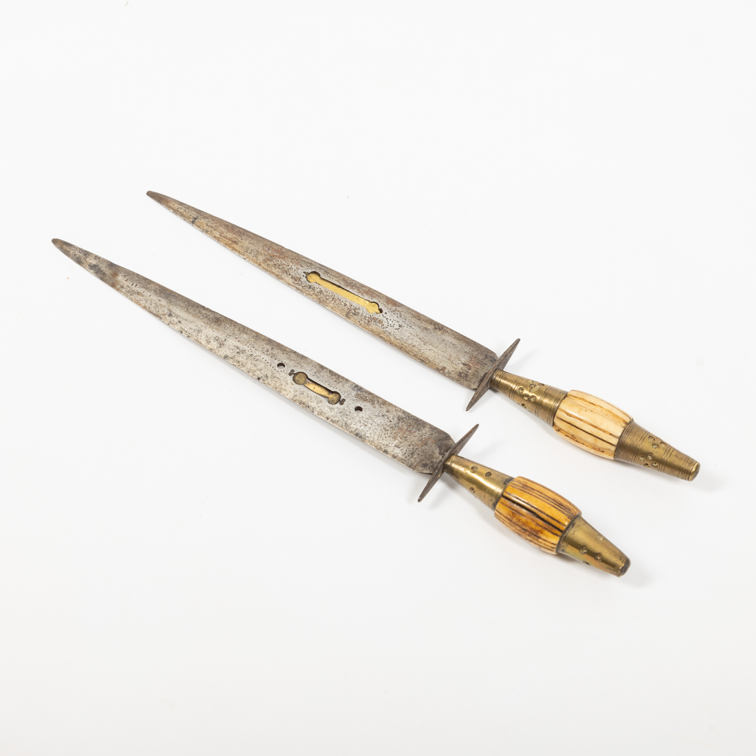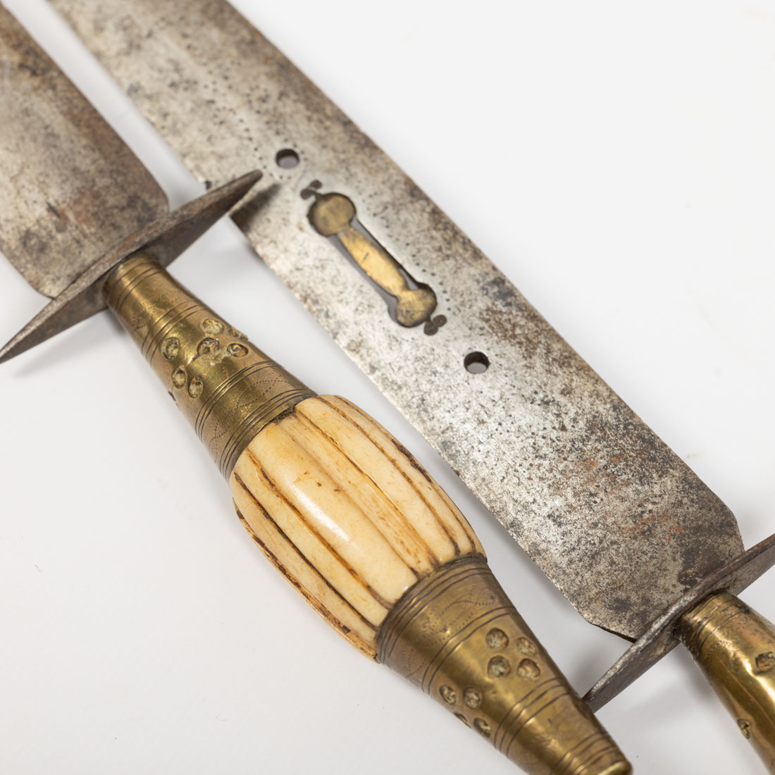 Espanha (Albacete ?), inicio do Séc XIX, para uso venatório. Lâmina vazada com palheta de metal para imitar o canto das aves. Punho oblongo canelado com partes córneas e metal. Esta forma peculiar tinha a vantagem de ser enfiada num cano, pistola ou espingarda, para atacar um animal mais perigoso. Bom estado. Comp. 30: 32 cm