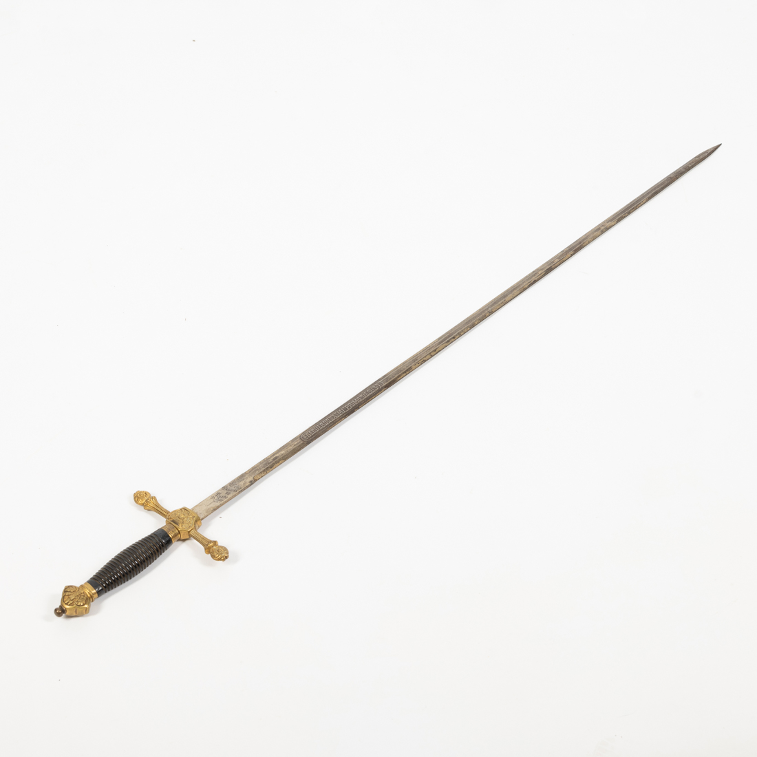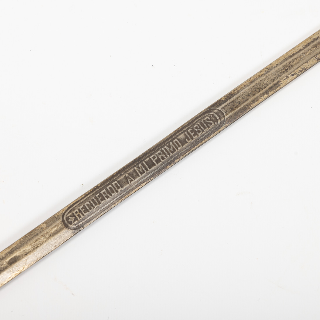 Com lâmina marcada Fabrica de Toledo. Pomo em bronze cinzelado em feitio de coroa com um Fascio falangista num dos lados, punho em madeira exótica anelada, guardas em cruz cinzeladas no memo estilo lâmina estreita com interessante e problemática dedicatória "RECUERDO A MI PRIMO JESUS" e do outro lado "RECUERDO de TU PRIMO DIONISIO Y SUS AMIGOS 1928" De notar o feroz regime "Roxo" que ensombrava a Península nesta data. Peça carregada de História. Sem bainha.