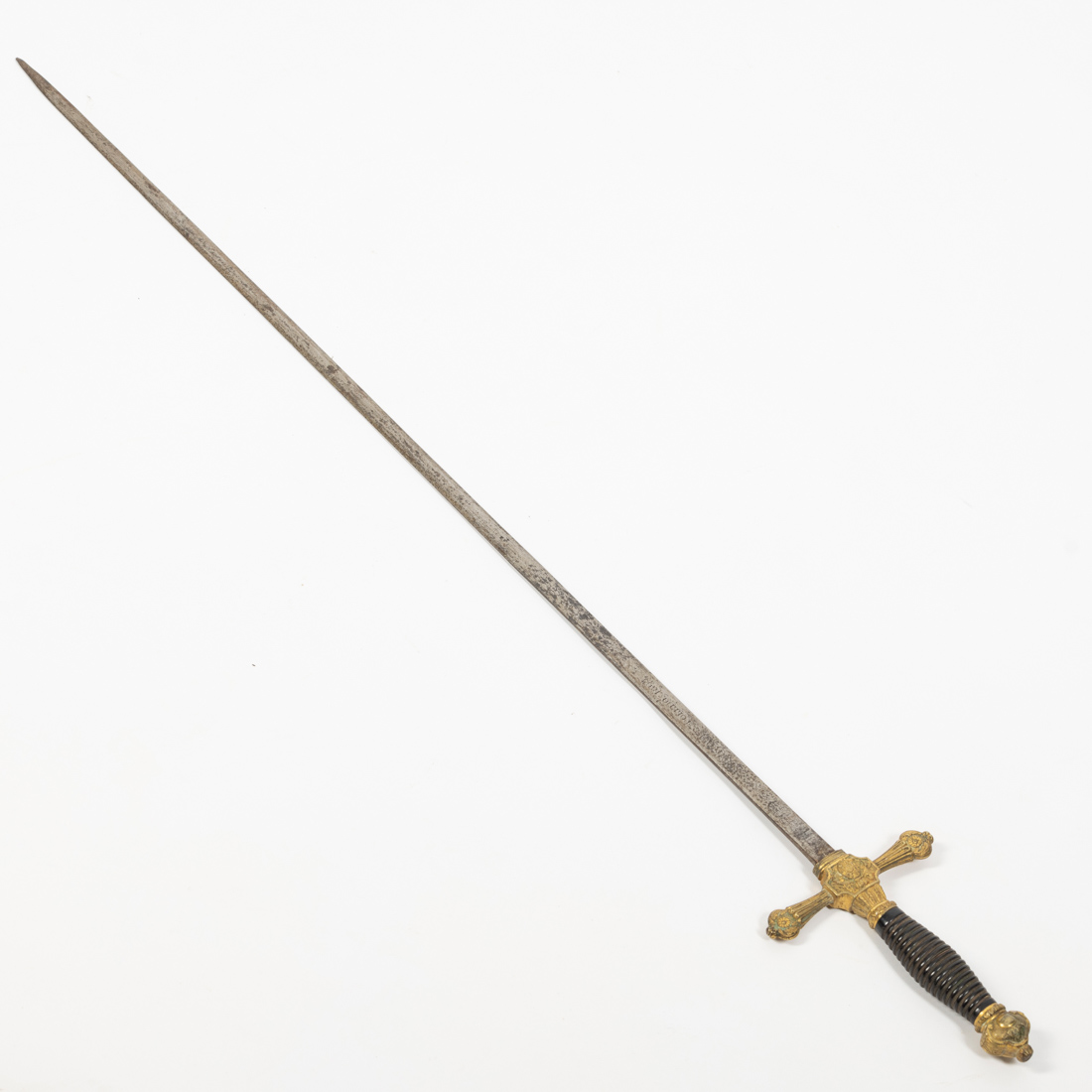 Com lâmina marcada Fabrica de Toledo 1863. Pomo em bronze cinzelado em feitio de coroa e símbolo da Arma, punho em madeira exótica anelada, guardas em cruz cinzeladas no mesmo estilo mas dos 2 lados as Armas de Espanha. Lâmina estreita e lisa. Tem no ricasso uma gravação que poderia ser as Armas de Espanha. Sem bainha.