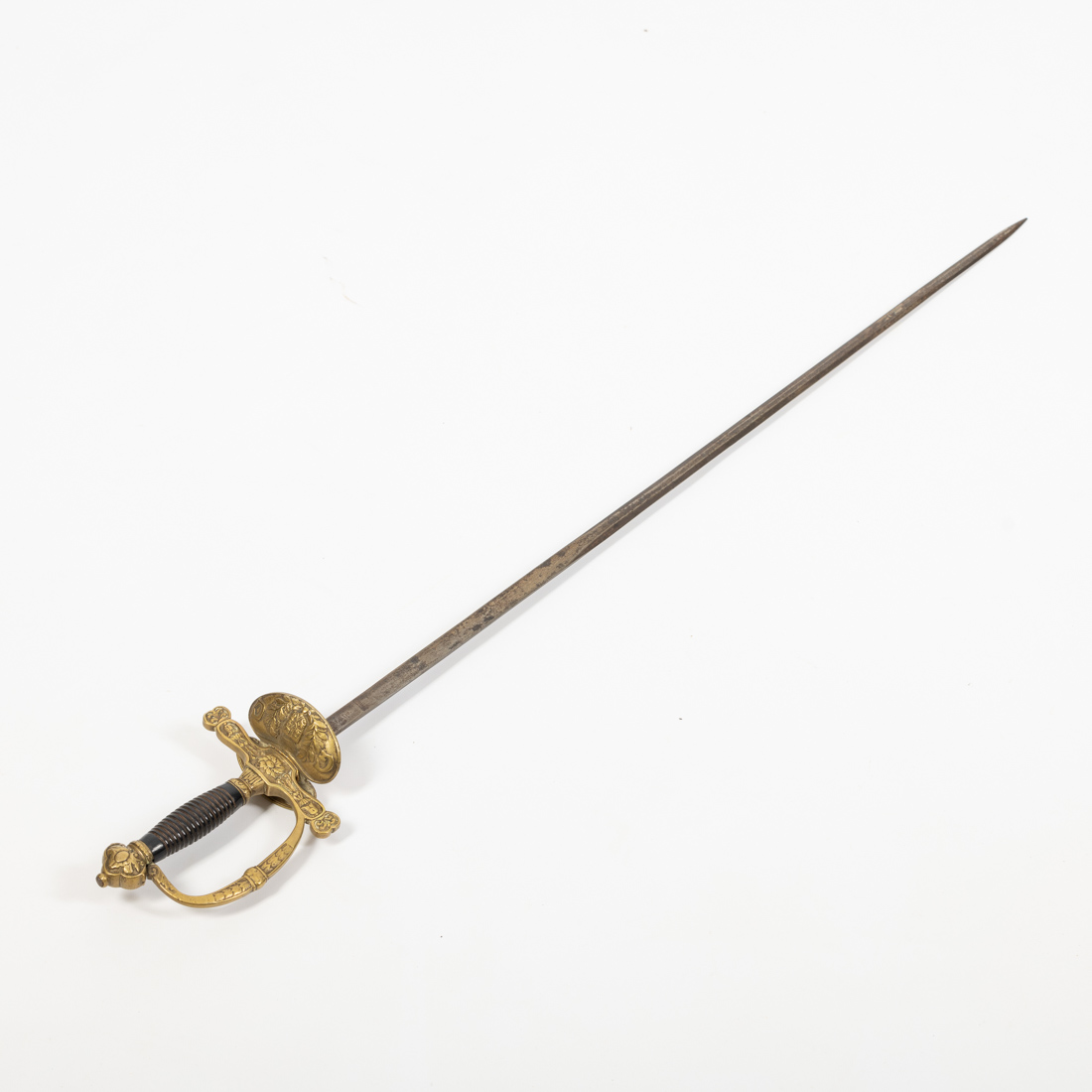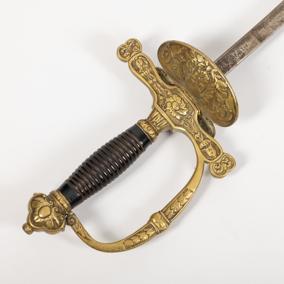 Com lâmina marcada Fabrica de Toledo. Pomo em bronze cinzelado em feitio de coroa, com punho em madeira exótica anelada, guardas em cruz cinzeladas no mesmo estilo com concha com as Armas de Espanha e iniciais GC. Lamina estreita completamente lisa. Sem bainha. Comp. 85 cm.