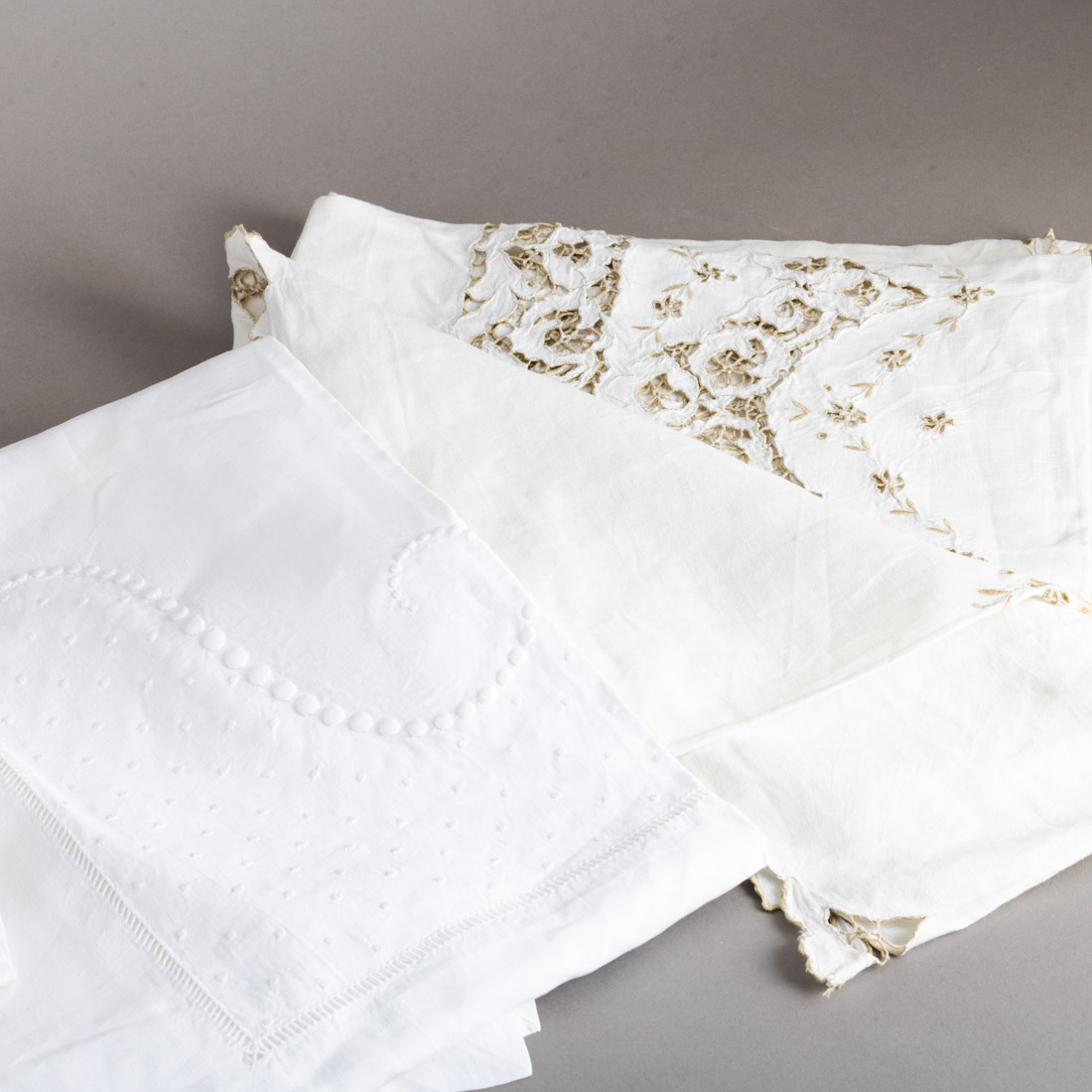 Uma francesa em linho branco bordado de excepcional qualidade, com doze guardanapos, e outra da Ilha da Madeira em linho bege bordado. Sinais de uso, pequenas manchas e pequenos defeitos.