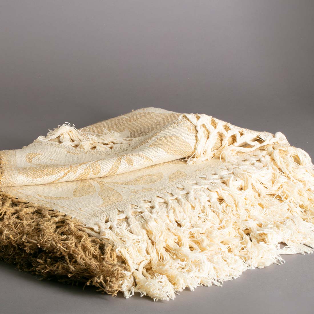 Em linho adamascado em tons bege. Sinais de uso e pequenas manchas de estar guardada.