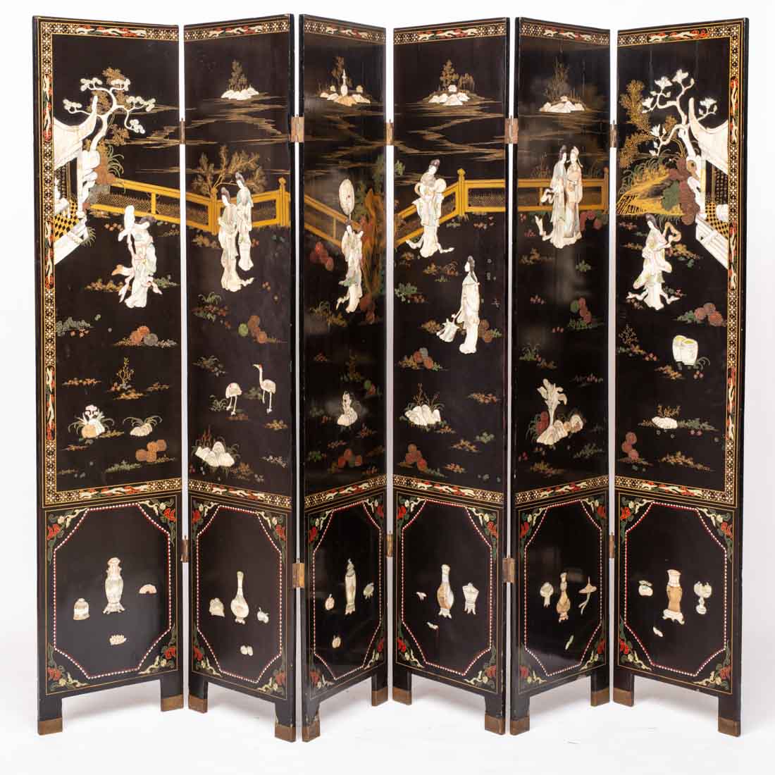 Em madeira lacada a negro, decoração policromada e dourada, com incrustações em madrepérola e osso, representando paisagens com figuras, pagodes, flores e objectos. Pés com montagens em metal. Falhas, restauros e vestígio de xilófagos. Dim: Folha: 183x40,5 cm. Total: 183x242,5 cm.