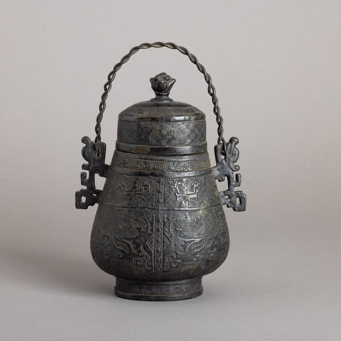 Em bronze patinado, decoração gravada com motivos geométricos, asas recortadas. China. Sinais de uso.