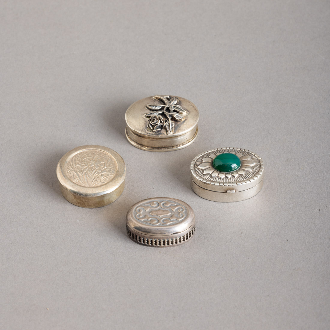 594. QUATRO CAIXAS PARA COMPRIMIDOS Em prata, duas de 925. P.A. 42,5 g.