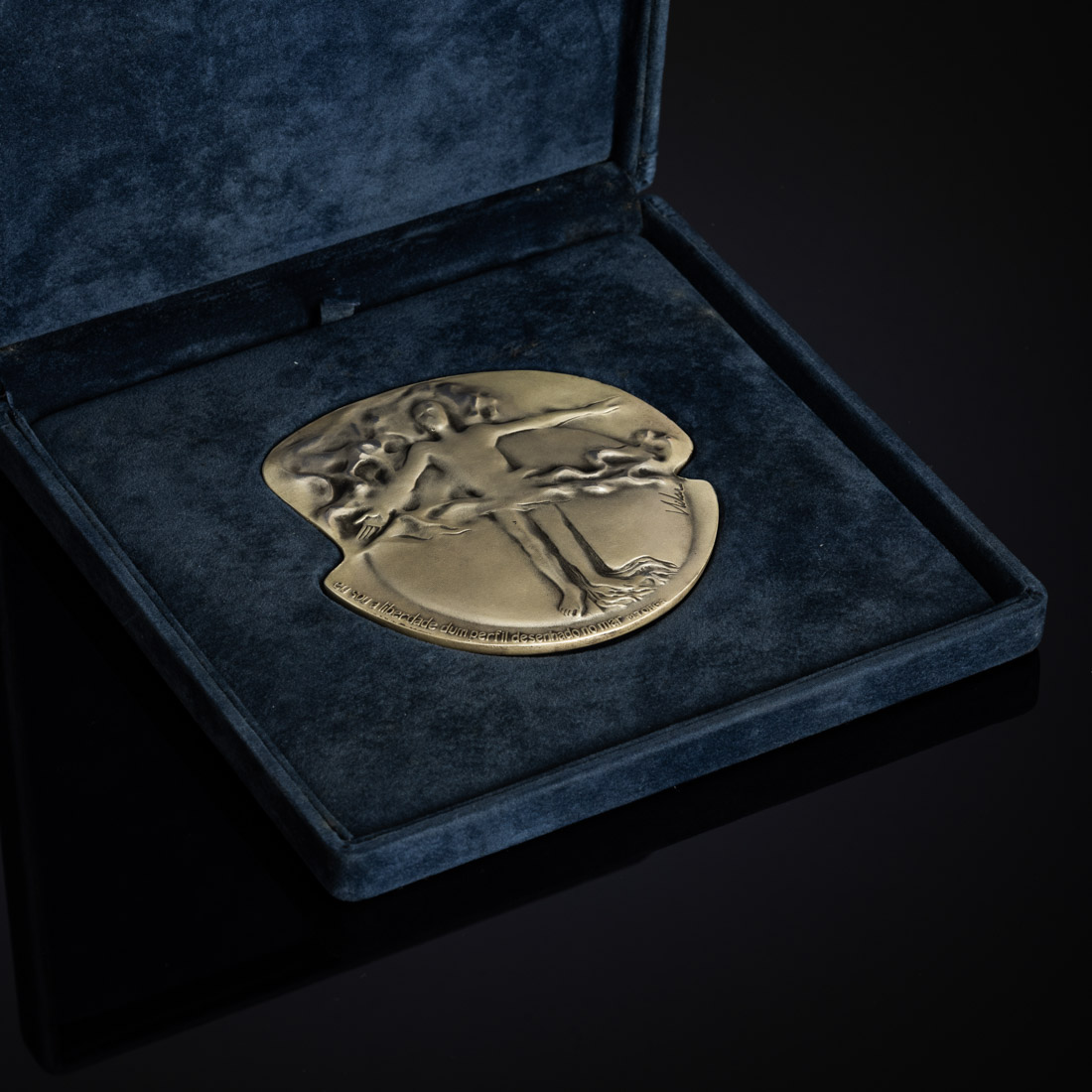 Em prata portuguesa, decoração relevada. Sem marcas ao abrigo do Decreto-Lei n.º 120/2017. Com estojo.