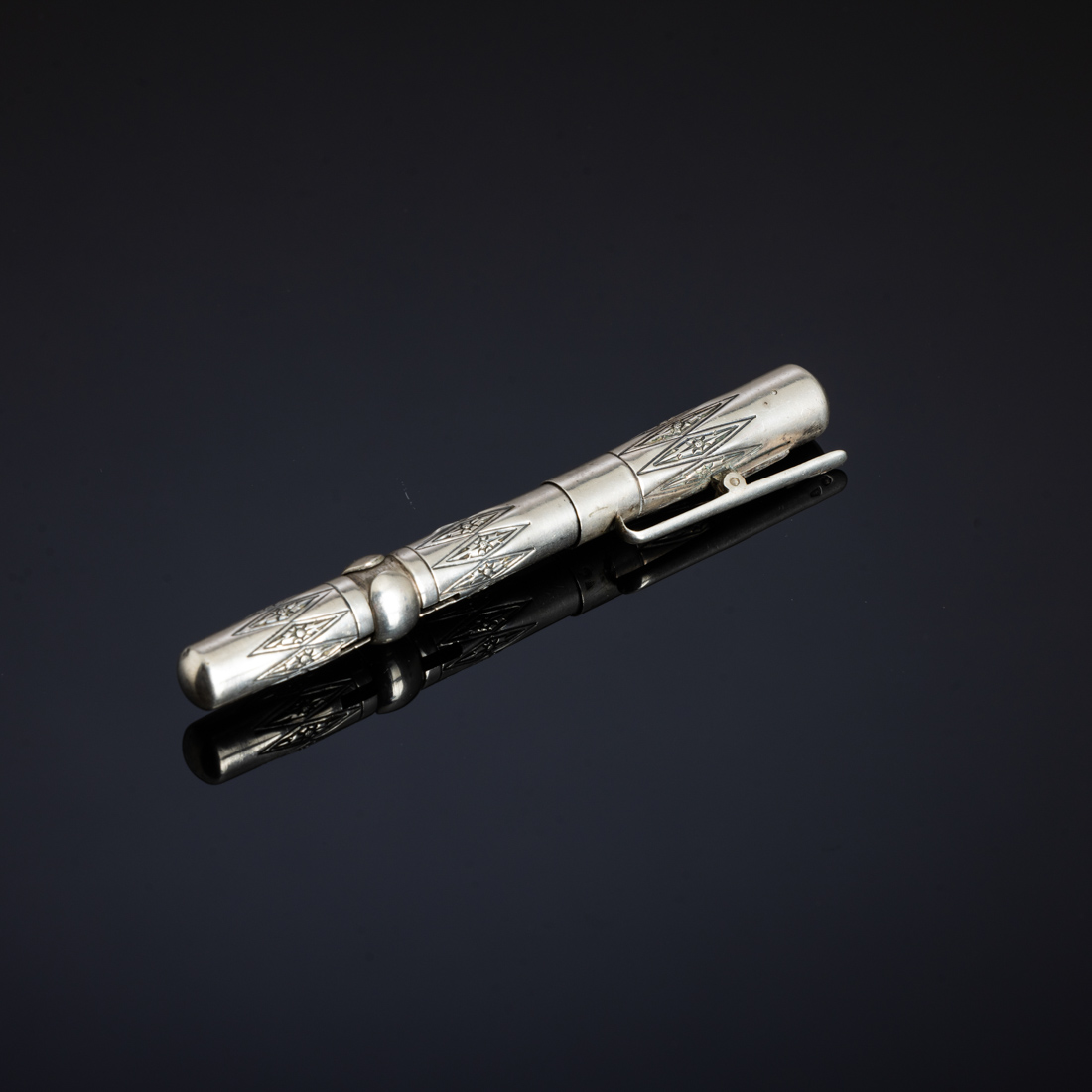 Em prata portuguesa contraste javali (1887-1937) de 833, decoração gravada "flores", aparo Paramount em ouro 14kt. Sinais de uso, pequeno defeito.
