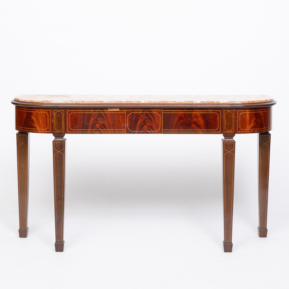 Em mogno e folheada a mogno, pernas de perfil quadrangular, tampo em mármore. Falhas e pequenos defeitos.