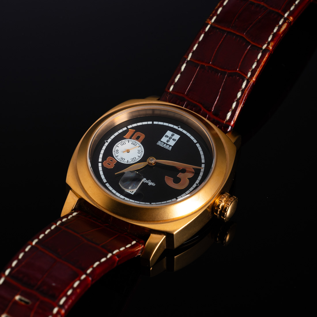 Caixa em aço e plaqué de ouro, movimento mecânico de corda. Edição limitada nº. 005/100. Em marcha. Sinais de uso.