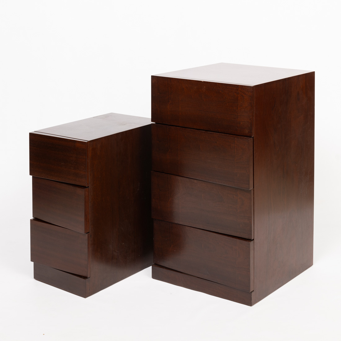 Em mogno e folheado a mogno, de quatro e três gavetas. Pequenos defeitos.