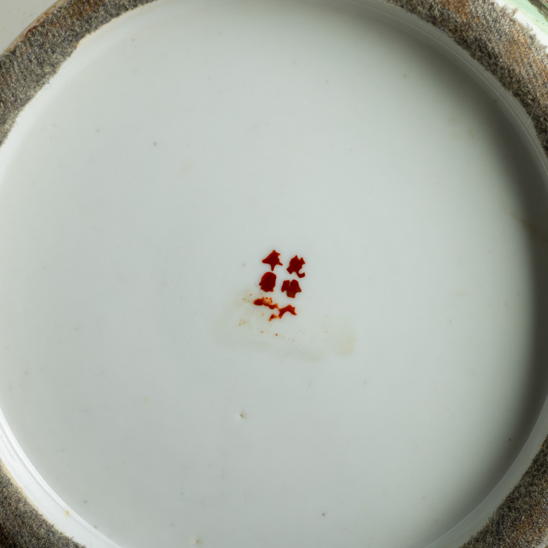 Em porcelana da China, decoração policromada e dourada "Paisagem montanhosa com casario e figuras" e caracteres, qilins em relevo. Marcada. Sinais de uso, desgaste no dourado.