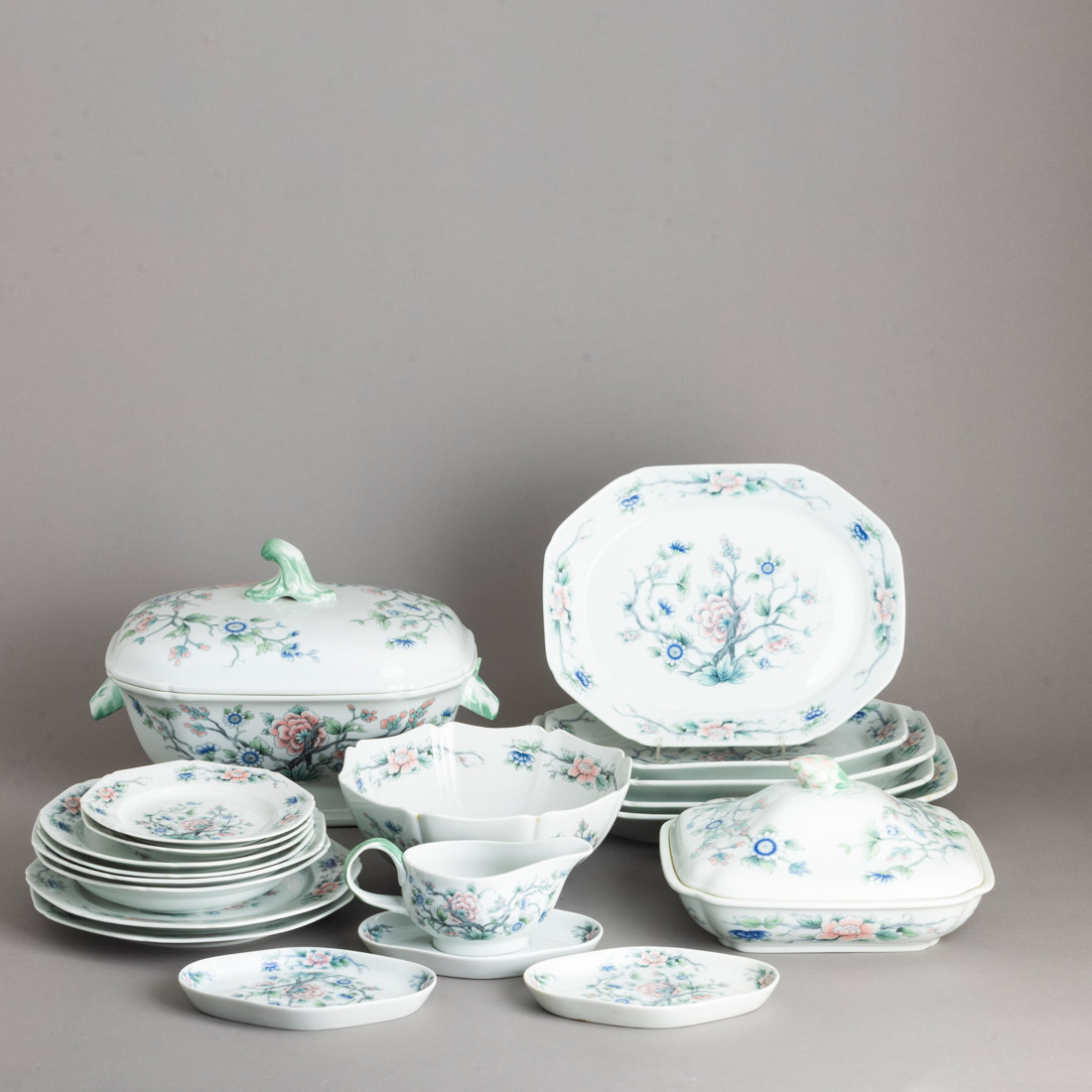 Em porcelana moldada (1980-1992), decoração policromada "flores". Composto por 24 pratos rasos, 12 fundos, 12 de sobremesa, 12 de doce, 5 travessas, terrina, molheira, saladeira, 2 pratos cobertos e 2 conserveiras. Um prato fundo com esbeiçadela.